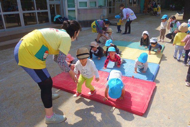 手をついてハイハイ歩きをしたり、ペンギン歩きをしたり、みんなで先生を押して倒したりしました!