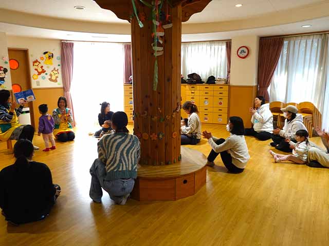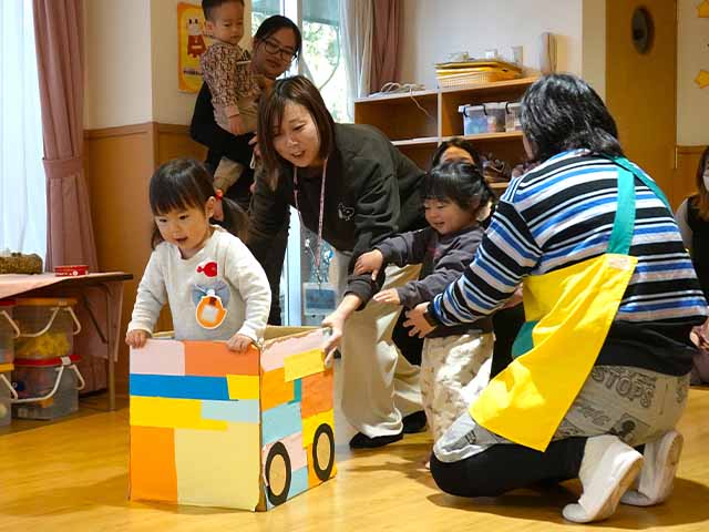 今日のちびっこさんは、まずはみんなで「バスに乗って」で触れ合い遊びをしました(*´ω`*)