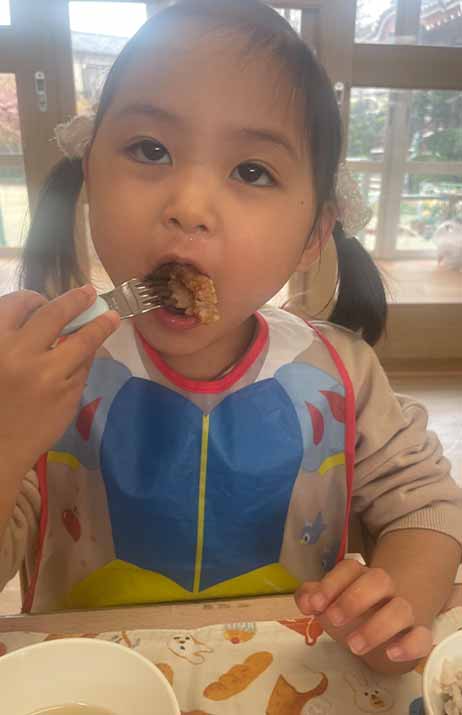 オーガニックレストランの美味しい給食は毎回楽しみです。子ども達大好きなメニューが続きました。どのメニューもどこにどのおかずを、置いて食べるのかを昼食を通して伝えていっています。大きなおかずをお箸やフォークで小分けにしてから食べることも3歳の子ども達にとっては初の体験です。食事のマナーをきちんと身に着けさせたり、感謝の気持ちも育てていきたいとおもっています。