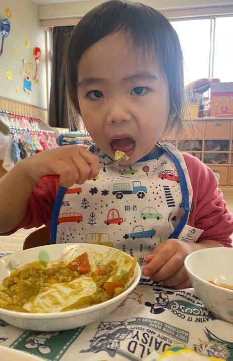 オーガニックレストランの美味しい給食は毎回楽しみです。子ども達大好きなメニューが続きました。どのメニューもどこにどのおかずを、置いて食べるのかを昼食を通して伝えていっています。大きなおかずをお箸やフォークで小分けにしてから食べることも3歳の子ども達にとっては初の体験です。食事のマナーをきちんと身に着けさせたり、感謝の気持ちも育てていきたいとおもっています。