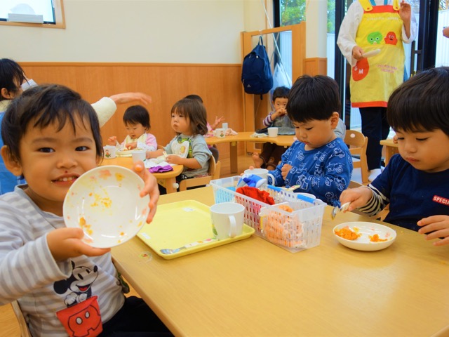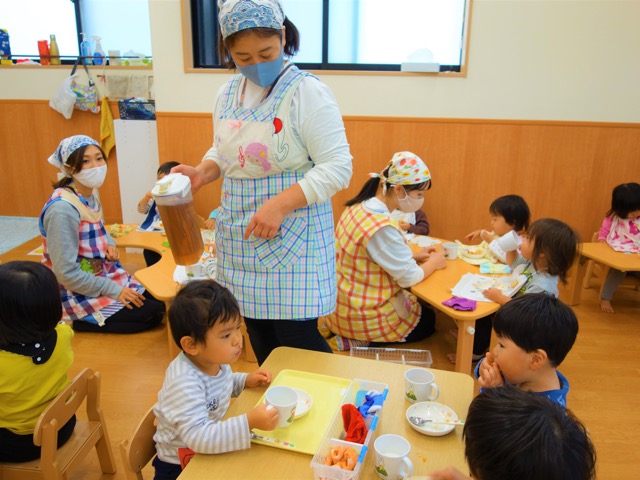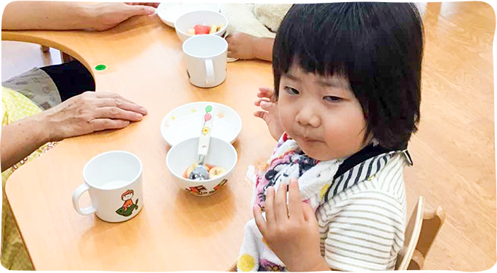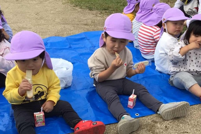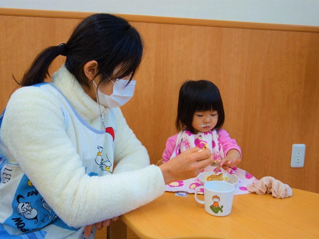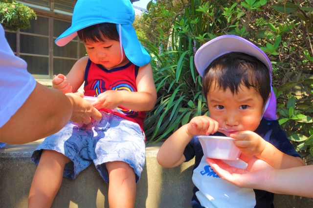 初めに、おやつタイムでお煎餅とリンゴジュースを飲んで、それから遊び始めました。