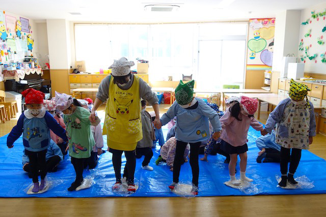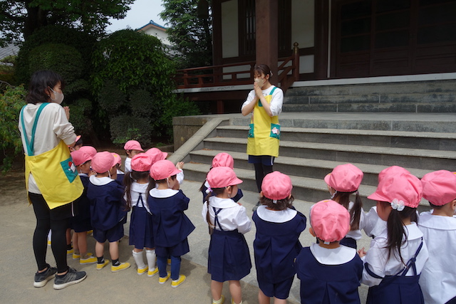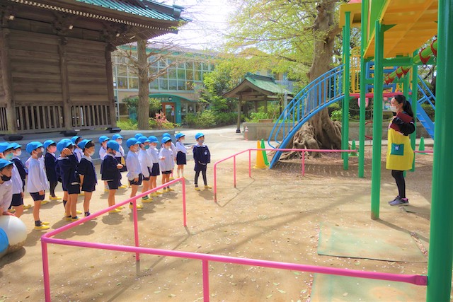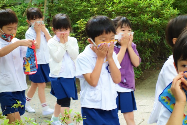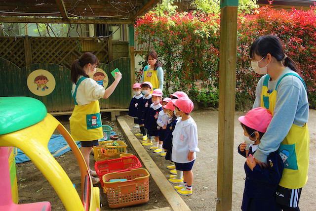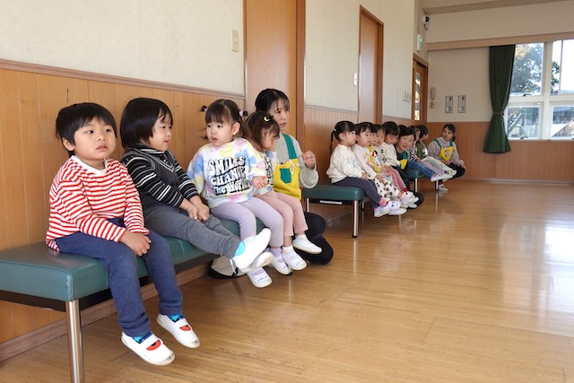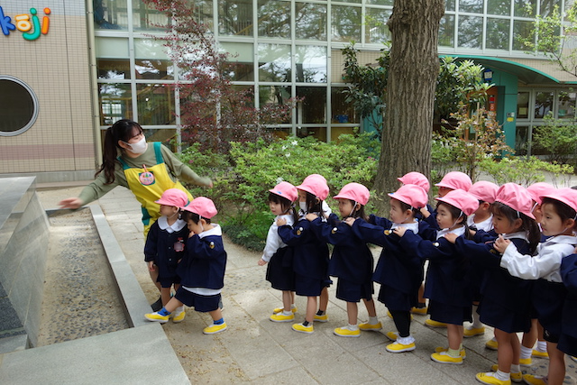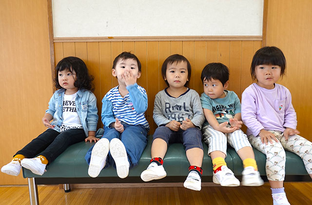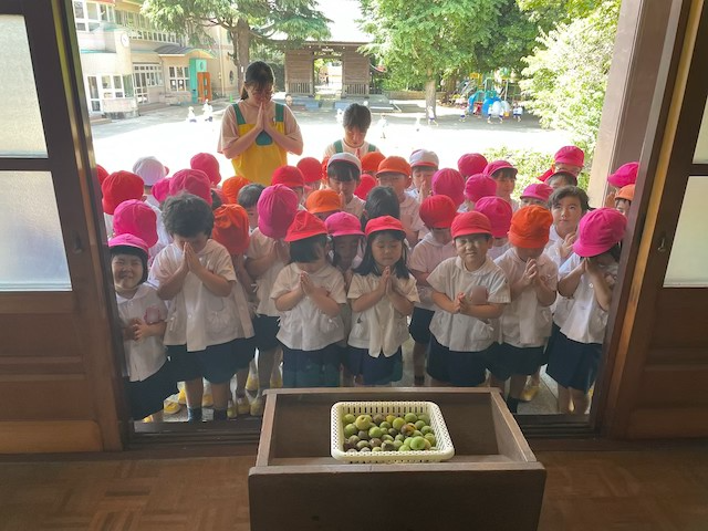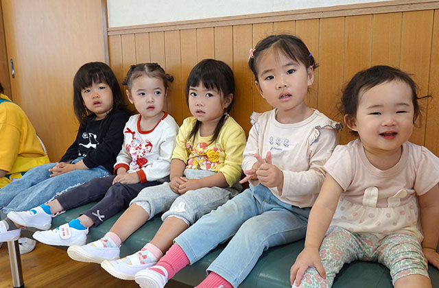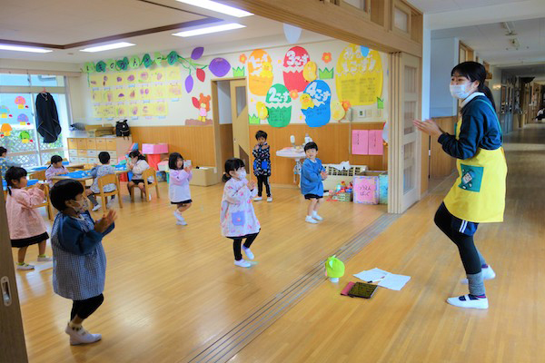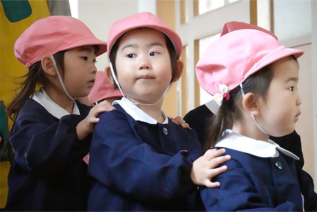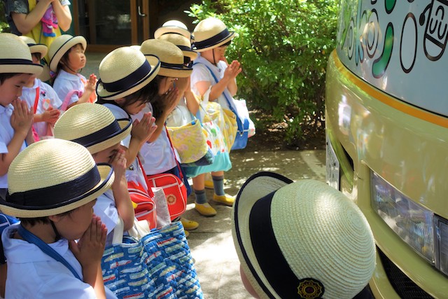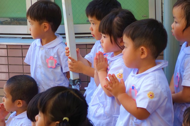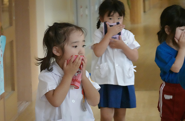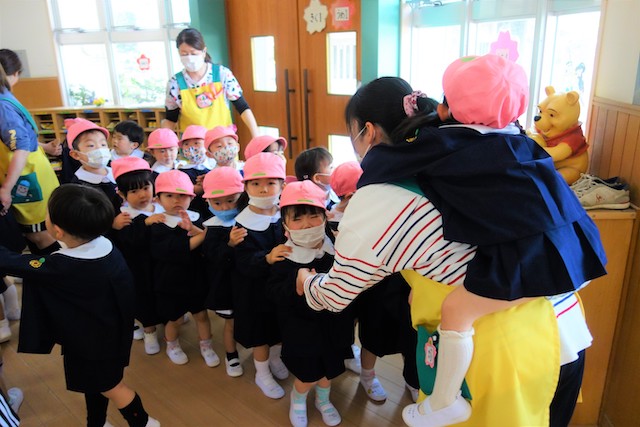 バスコースや歩きコース子どもたちが登園し、バスコースの子ども達はのの様に手を合わせてクラスに入ります。