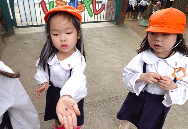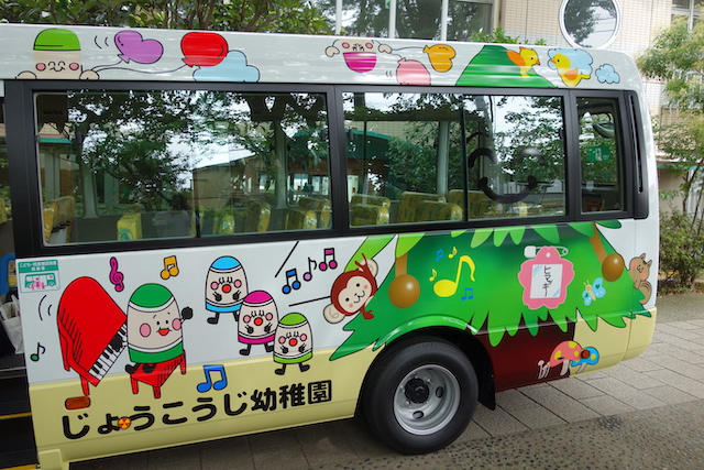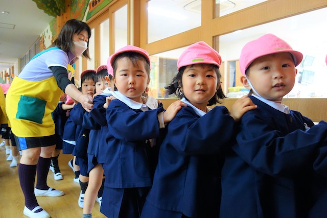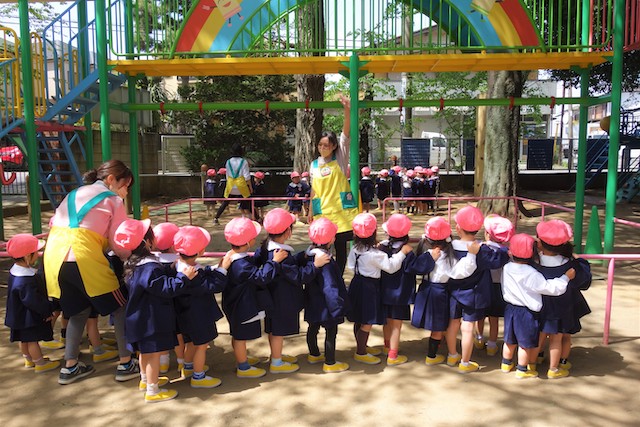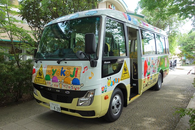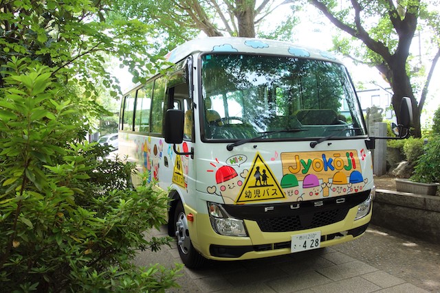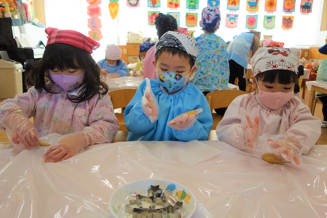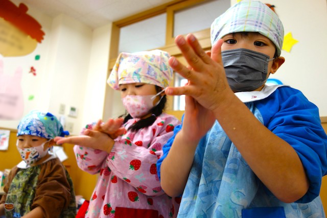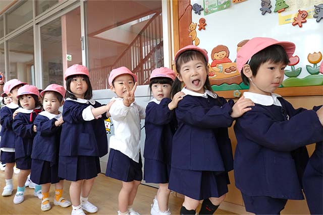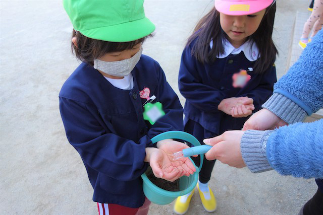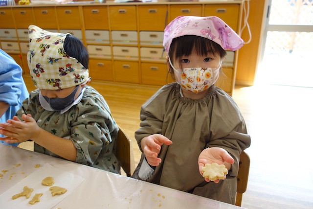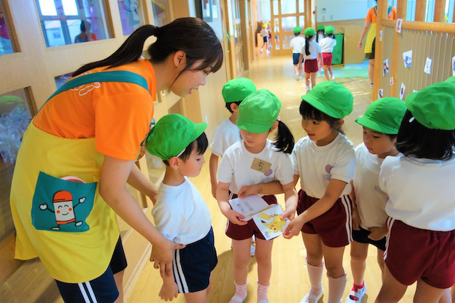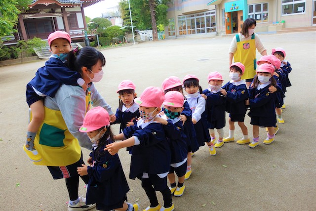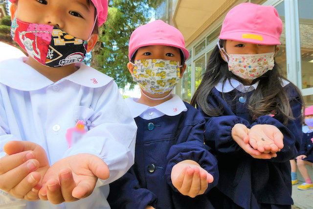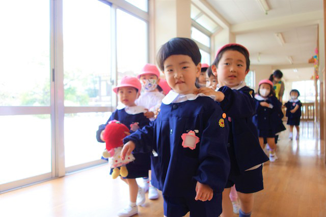 バスコースや歩きコース子どもたちが登園し、バスコースの子ども達はのの様に手を合わせてクラスに入ります。