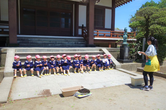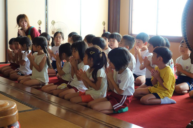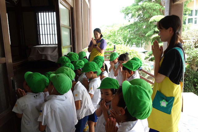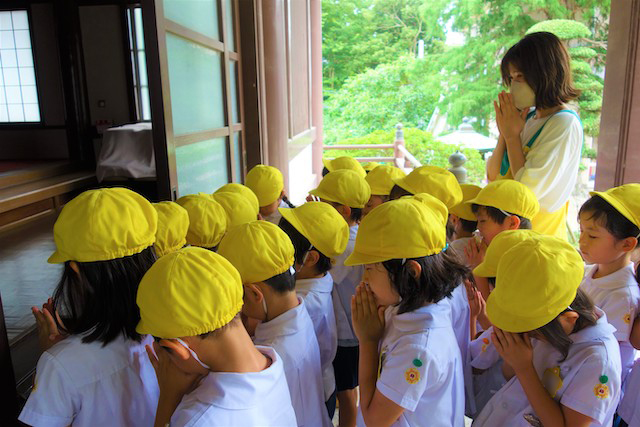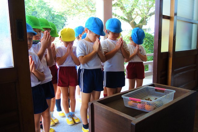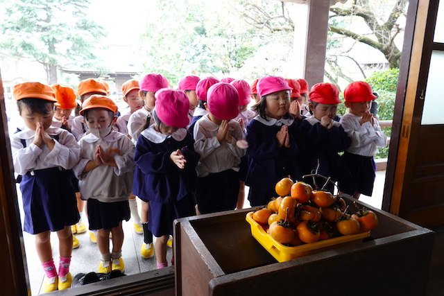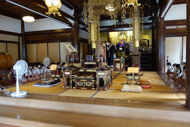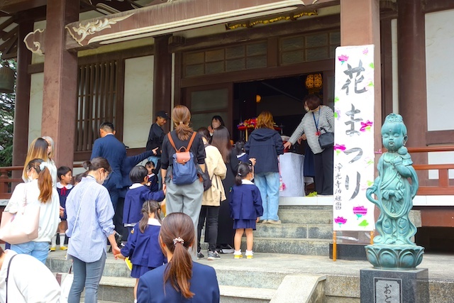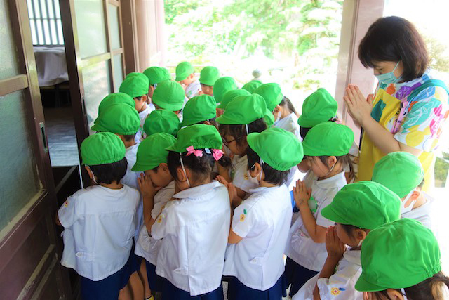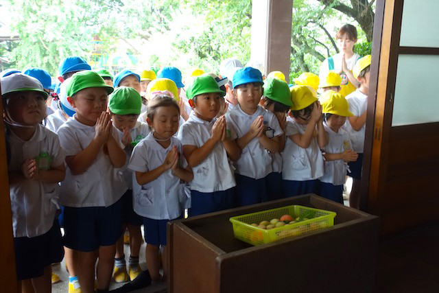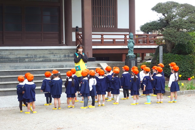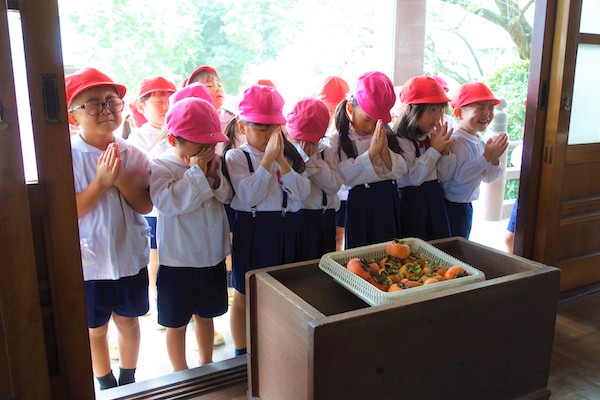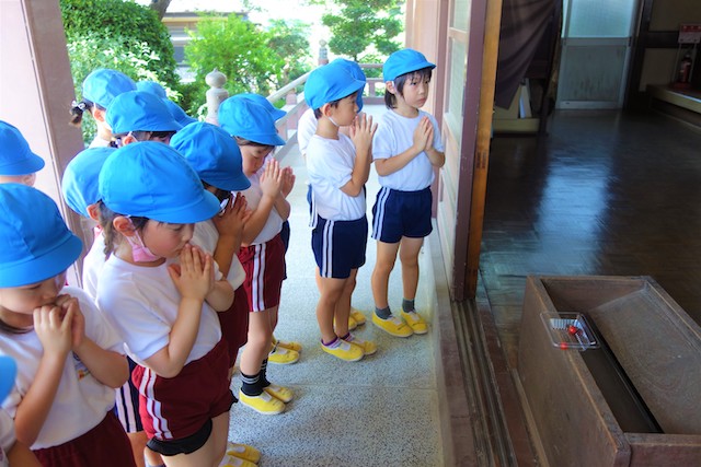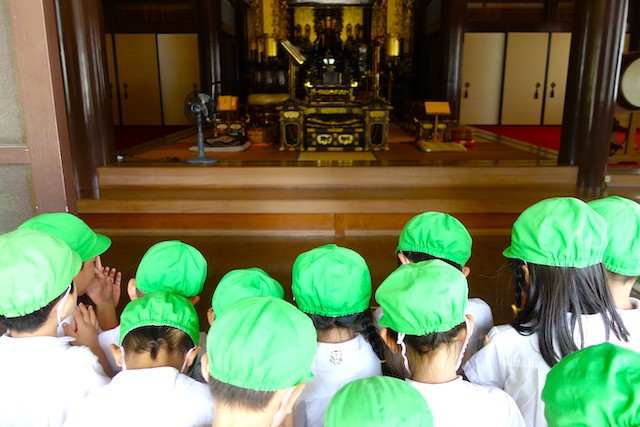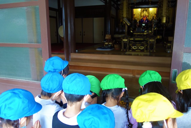歩きコースの子ども達は帰りに本堂前でのの様に手を合わせます。