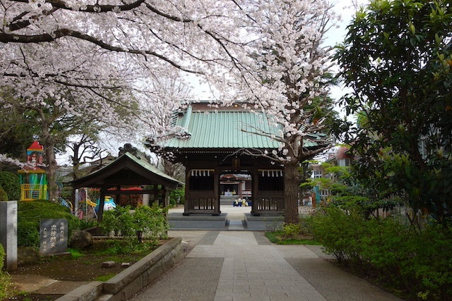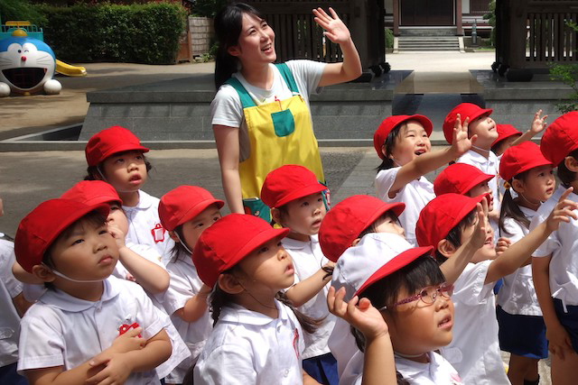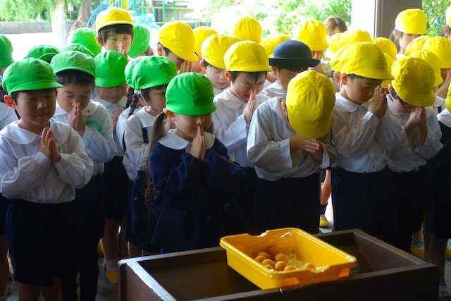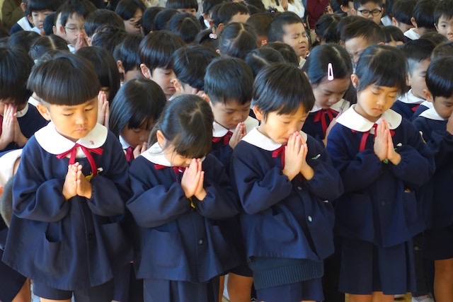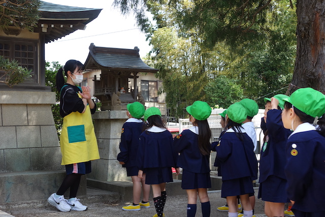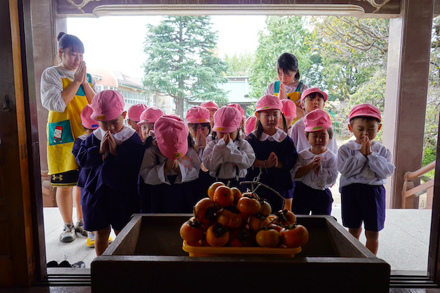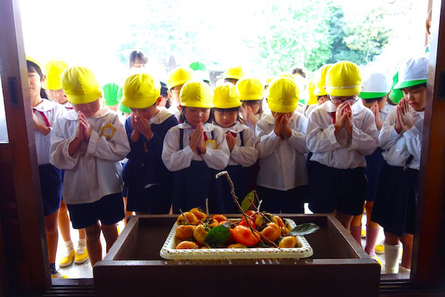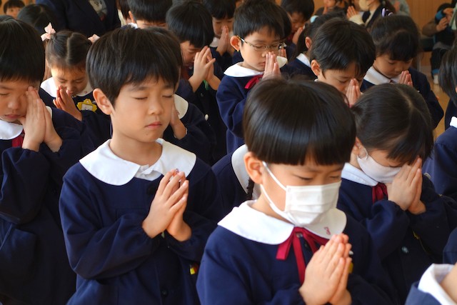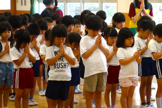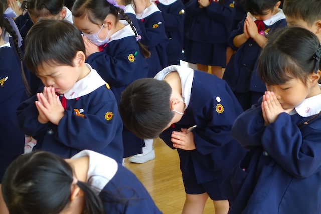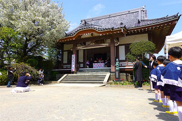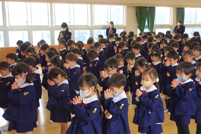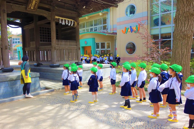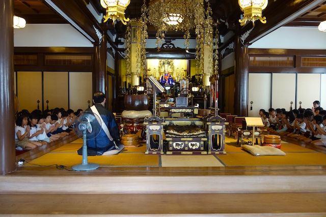 歩きコースの子ども達は帰りに本堂前でのの様に手を合わせます。