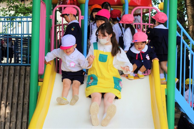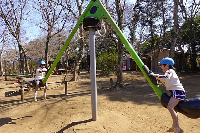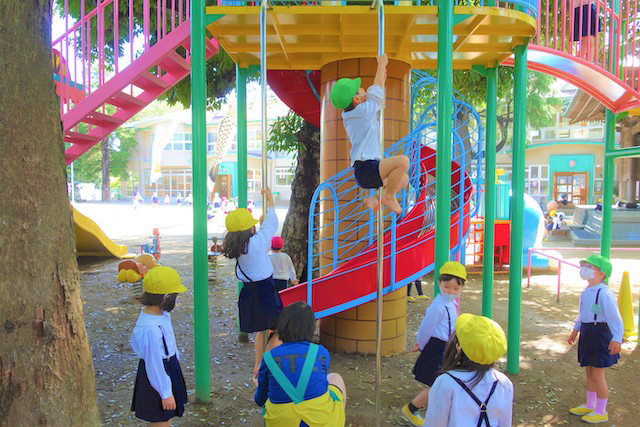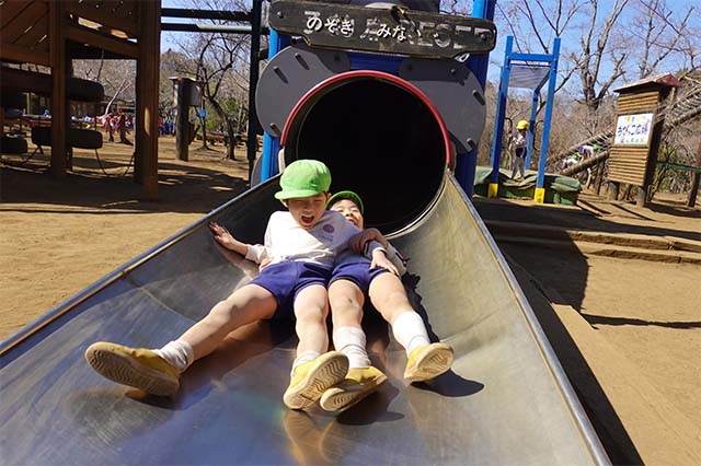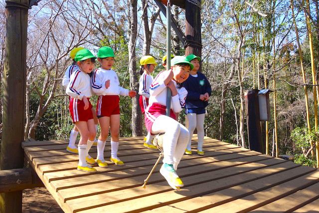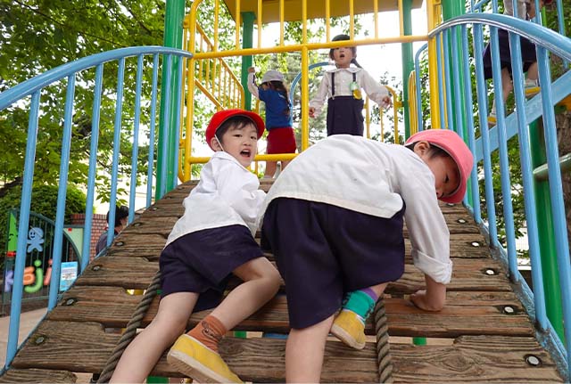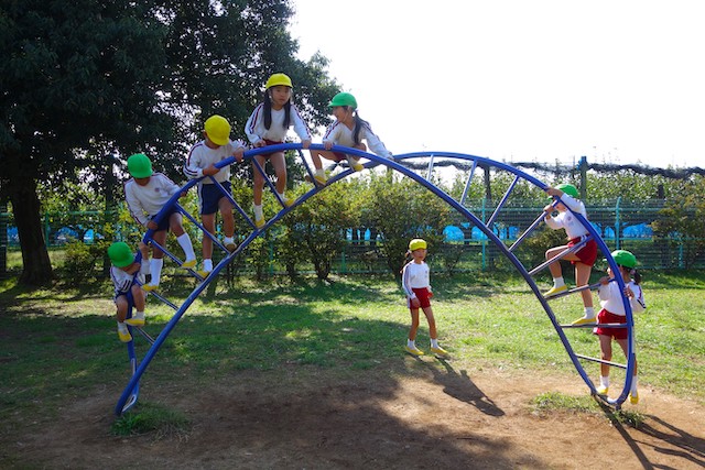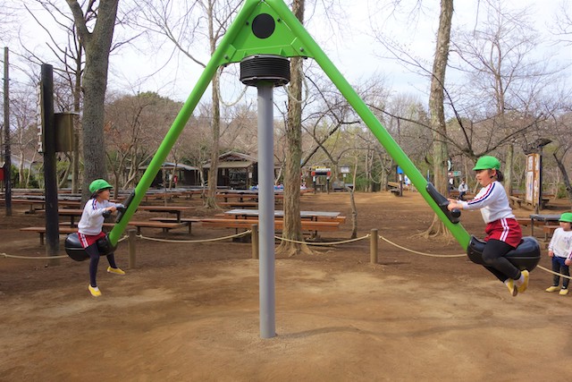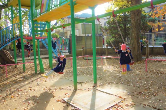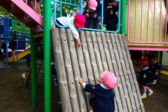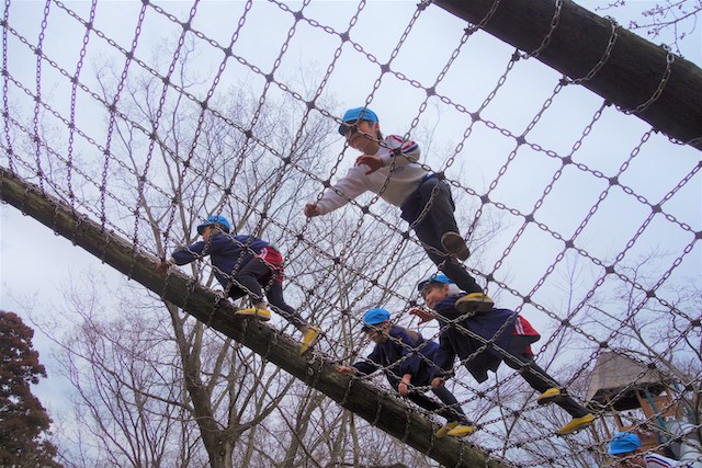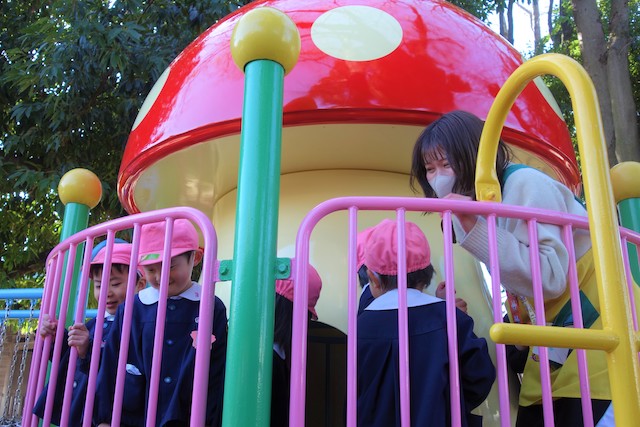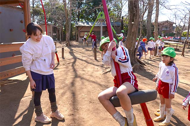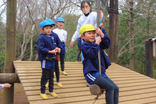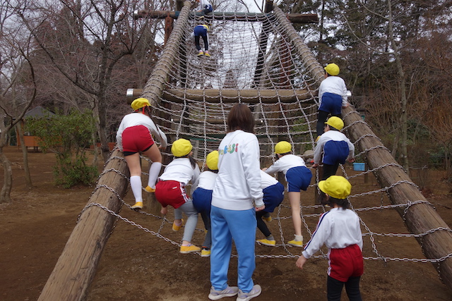 その他コンビネーション遊具も人気で、たくさんの子ども達が順番に並んで遊んでいます。特に年長は年少の手をとり、遊んでくれています。