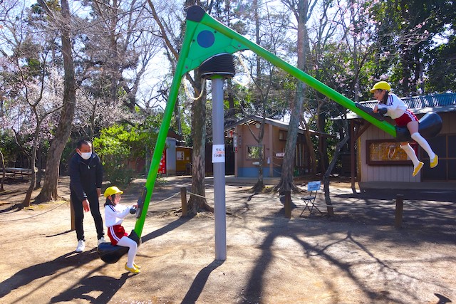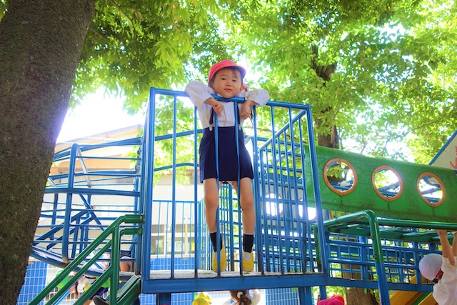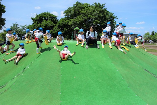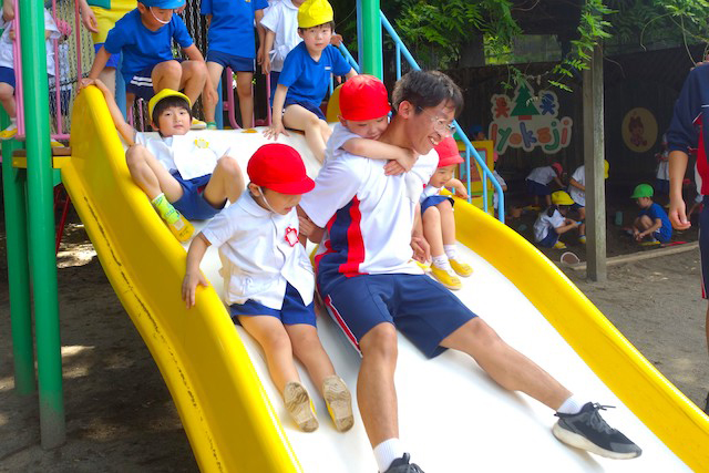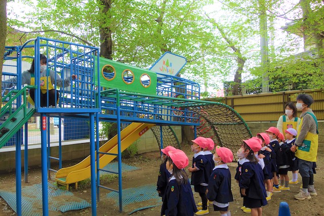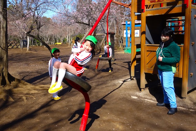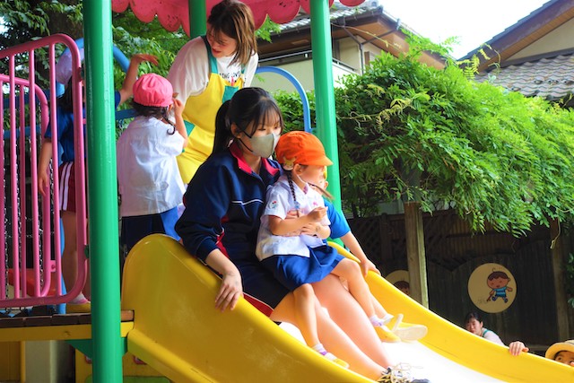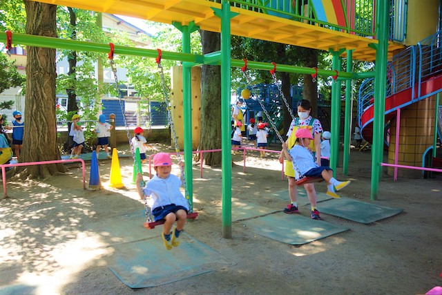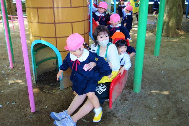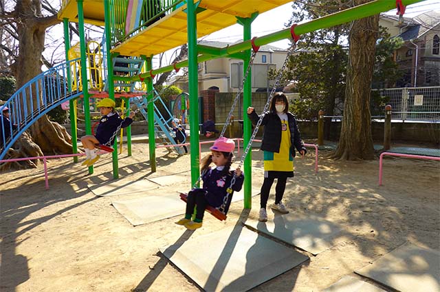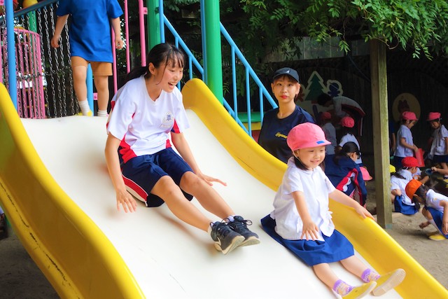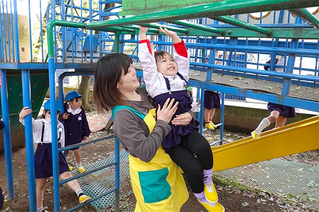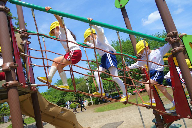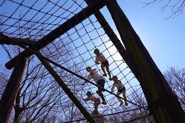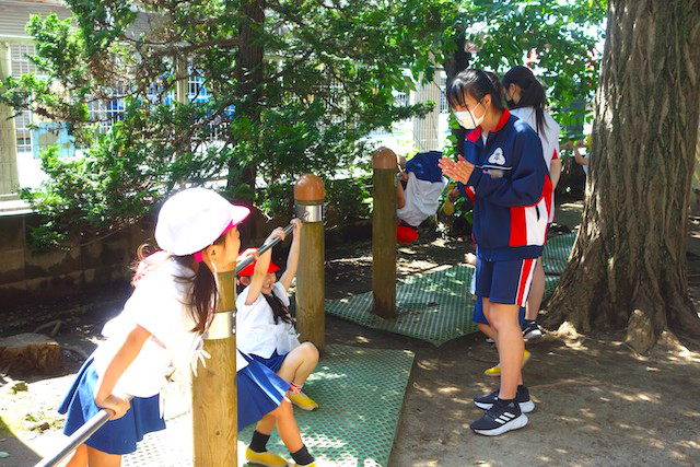 その他コンビネーション遊具も人気で、たくさんの子ども達が順番に並んで遊んでいます。特に年長は年少の手をとり、遊んでくれています。