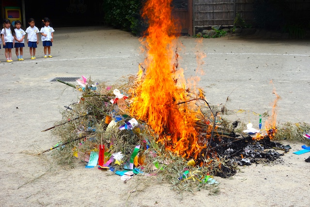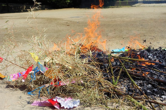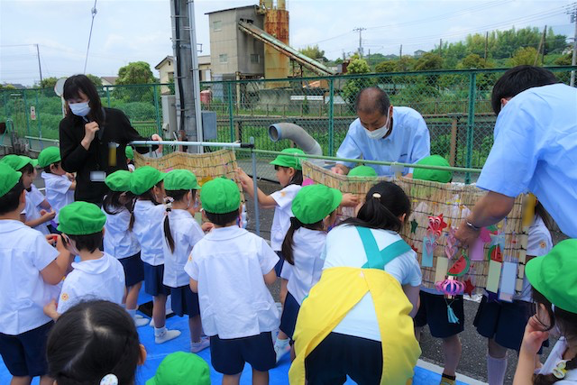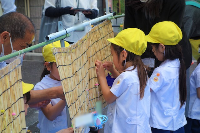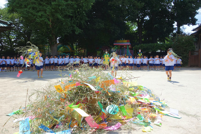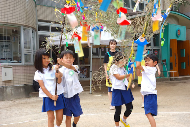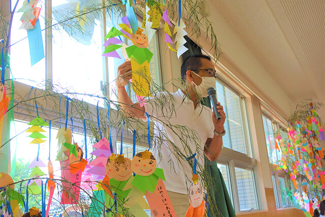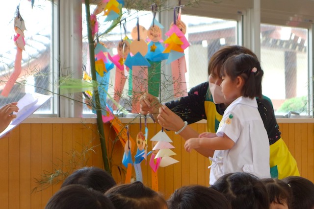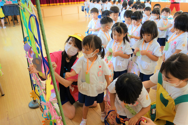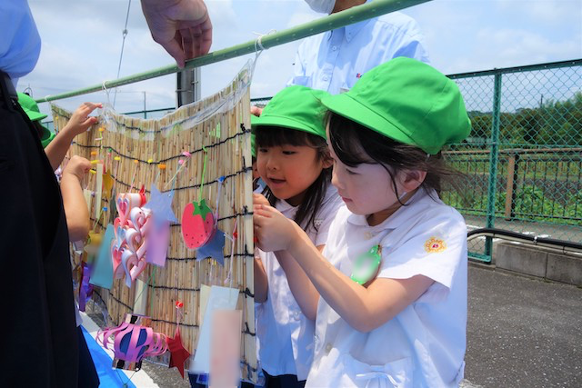 - 笹に全園児で手作りの飾りをつけます。短冊に願いを書いて手を合わせている姿を見ると心が洗われます。