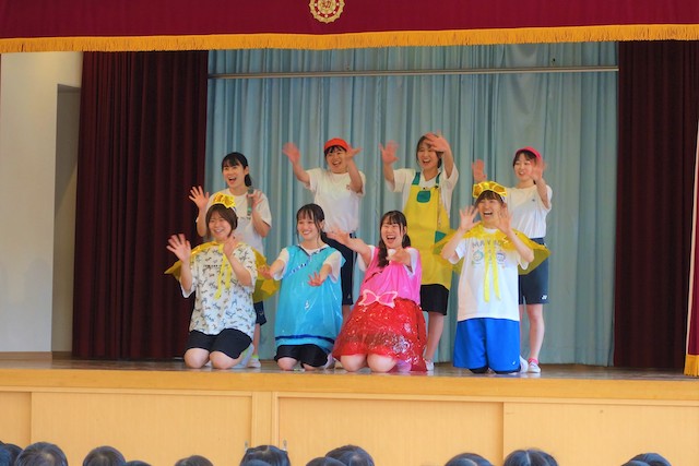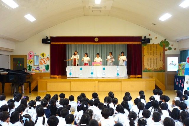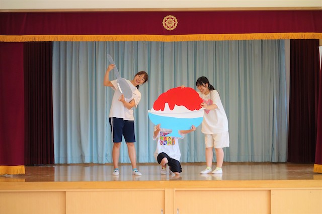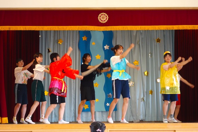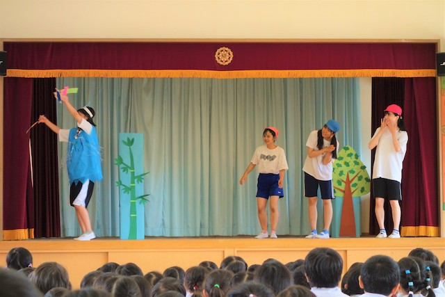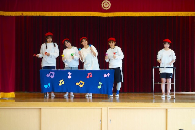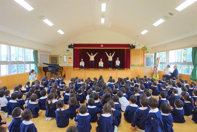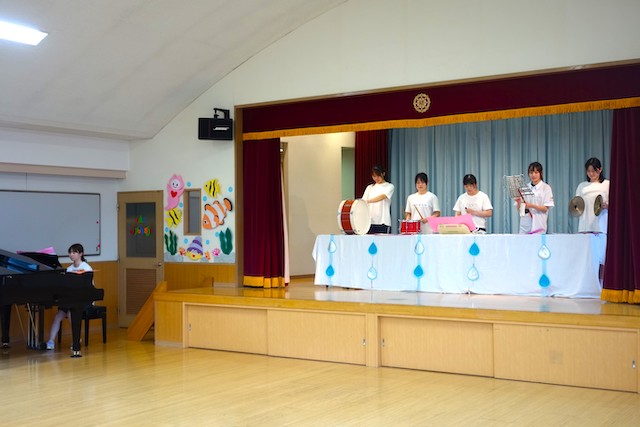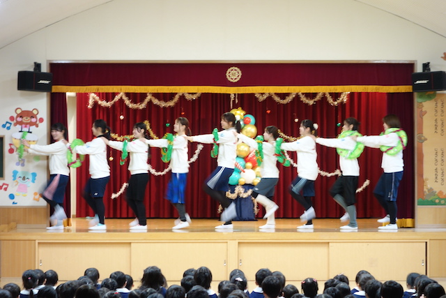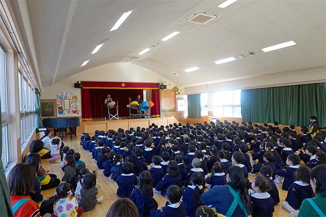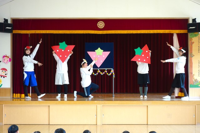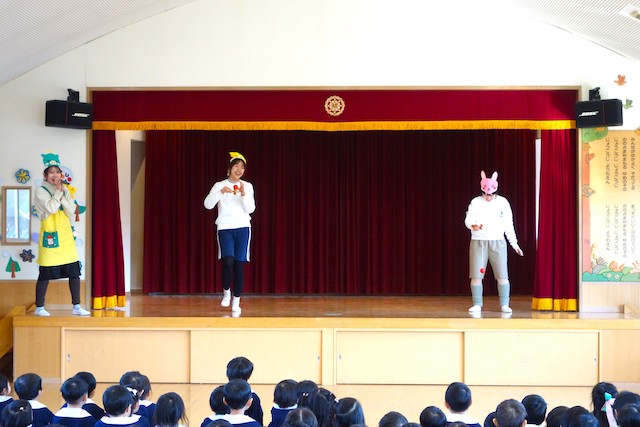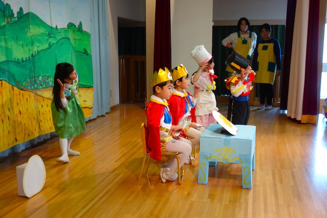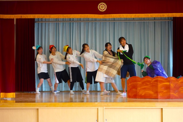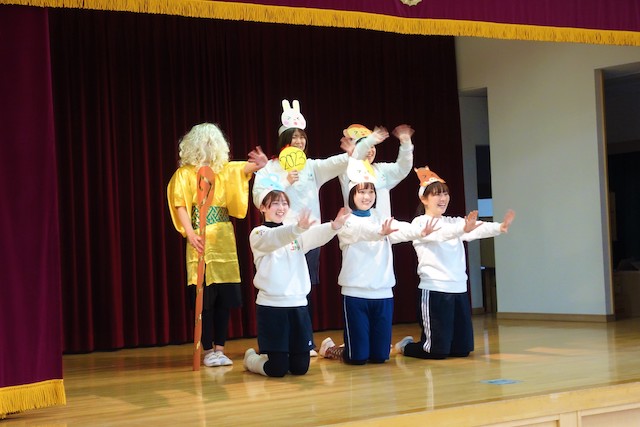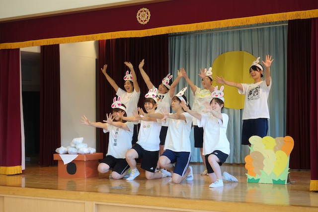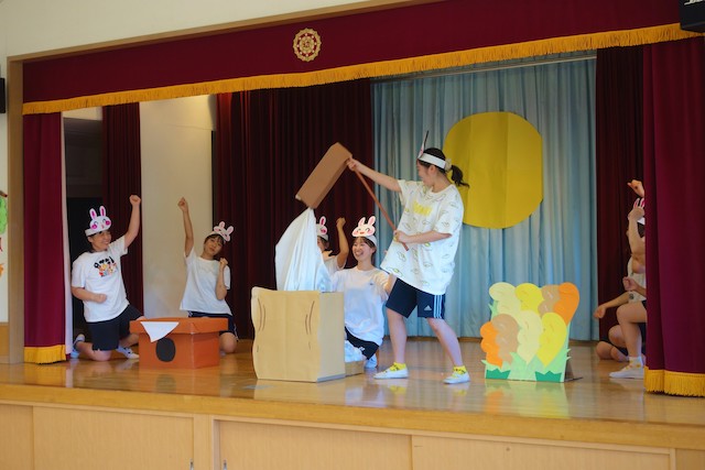- 合唱や合奏の他、劇、遊戯をホールで披露します。