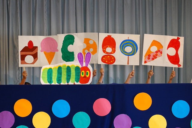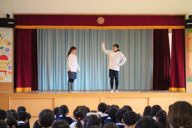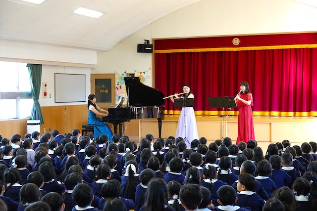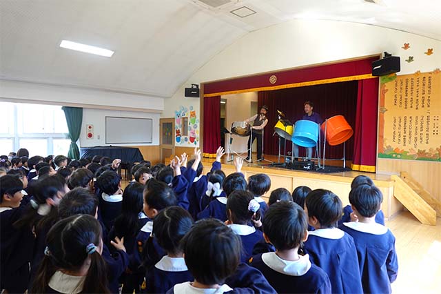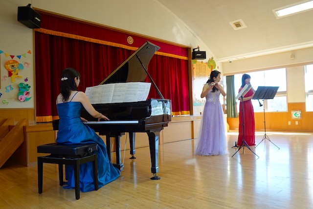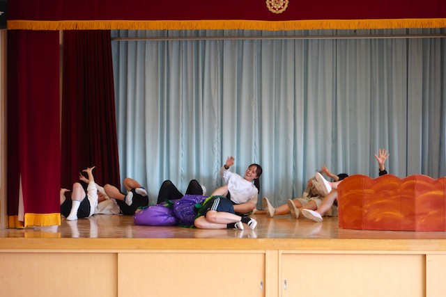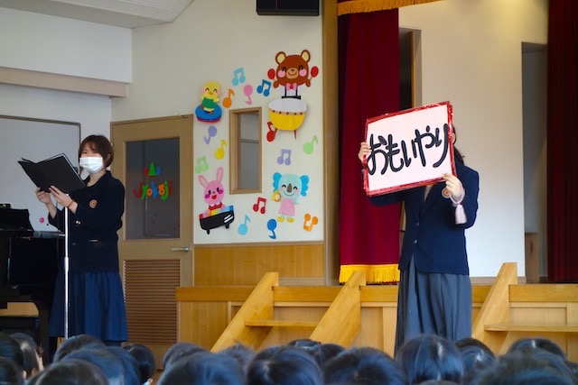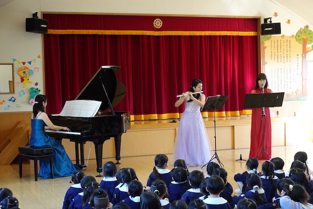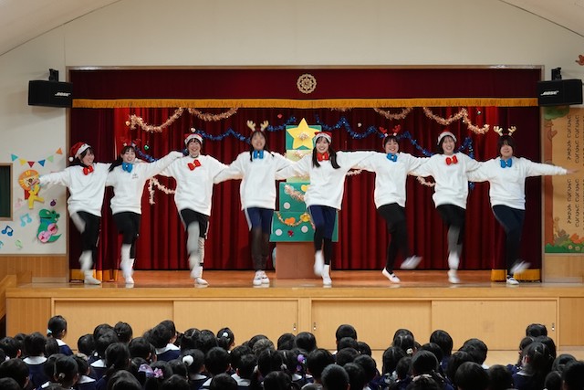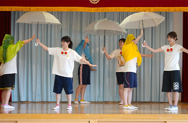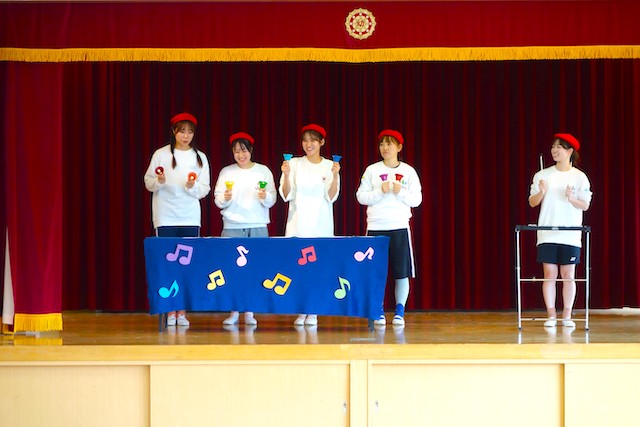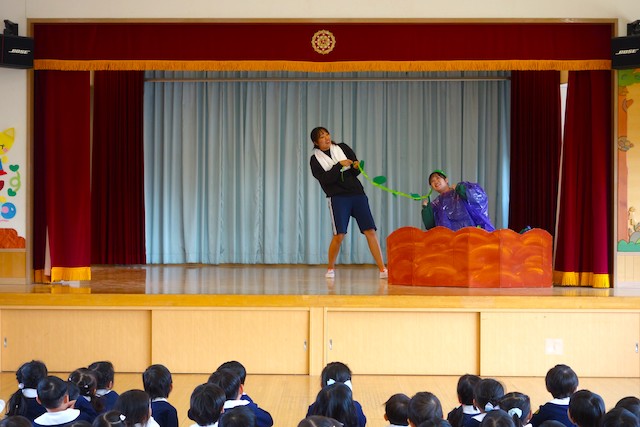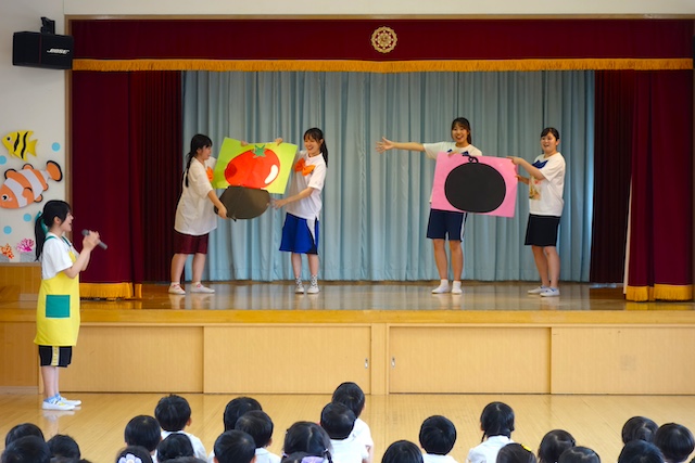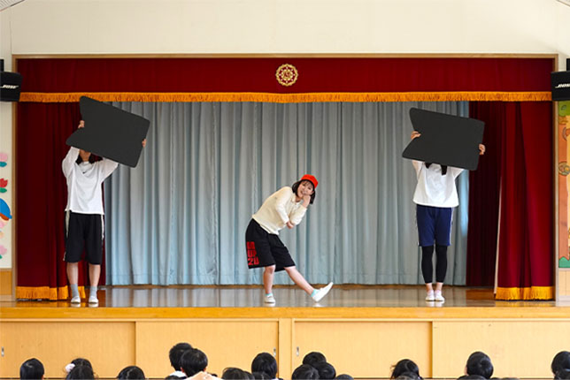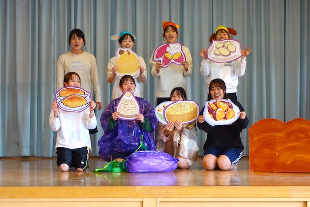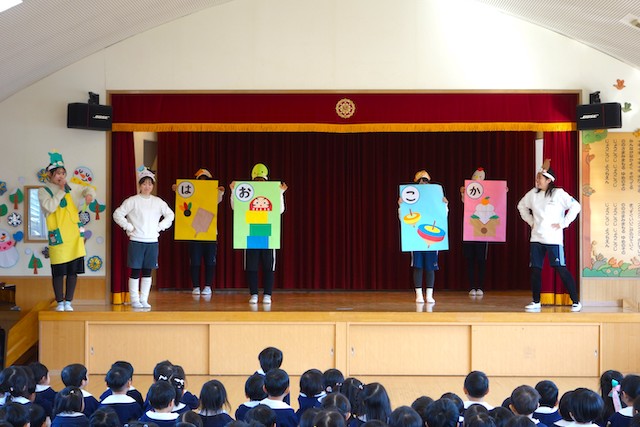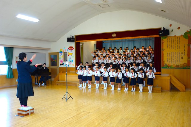 - 合唱や合奏の他、劇、遊戯をホールで披露します。
