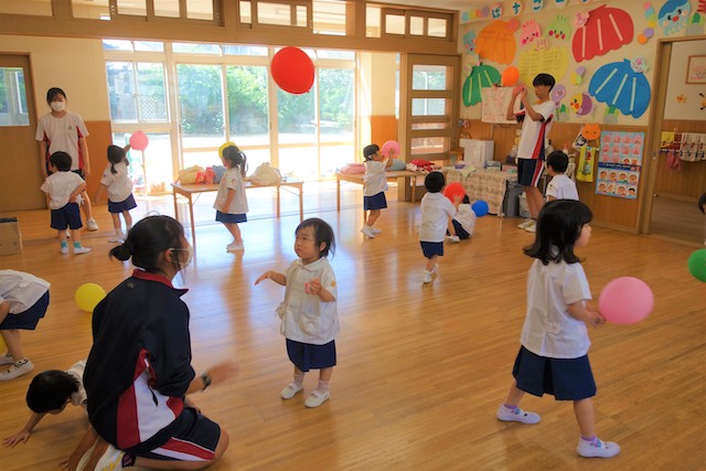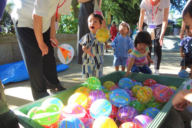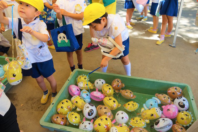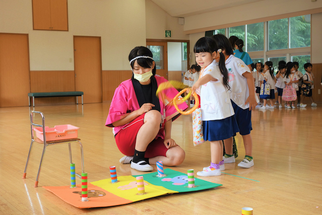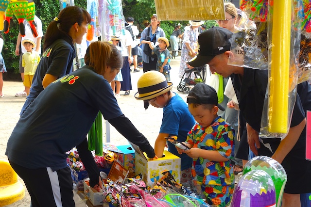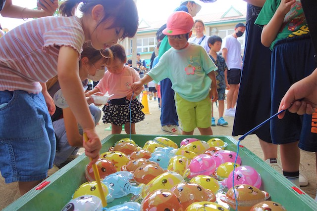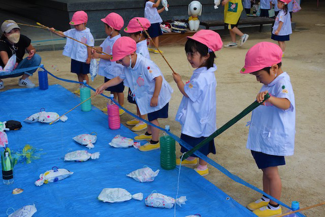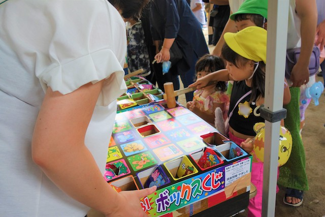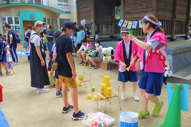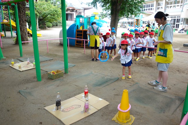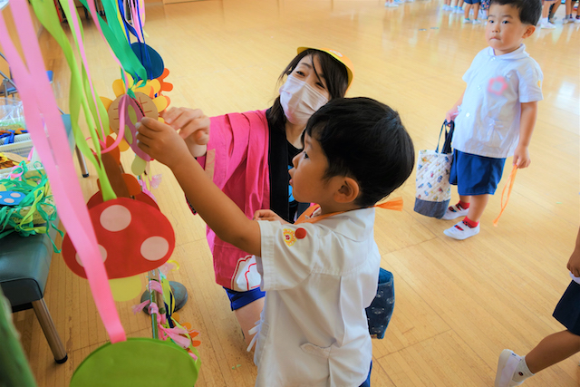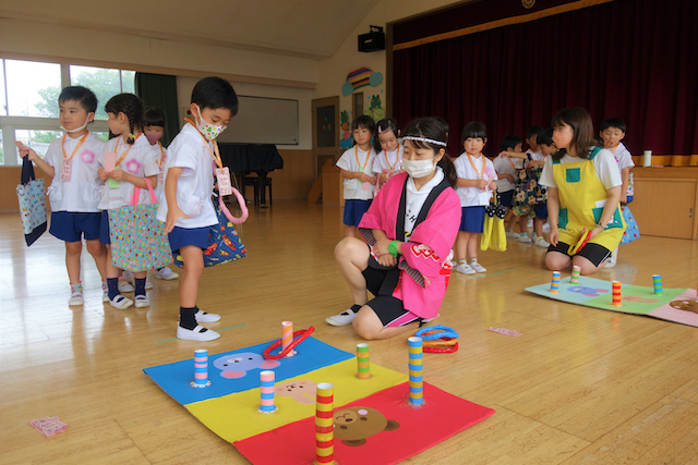 手作りおもちゃや焼きそば、フランクフルト、わたあめ、ヨーヨー等、幼稚園が楽しいお祭り会場に変身します。