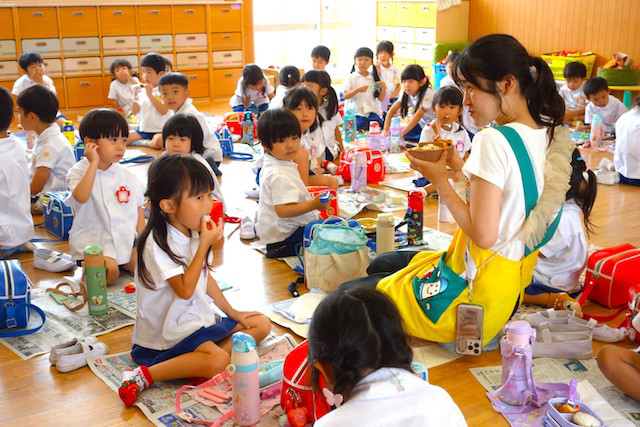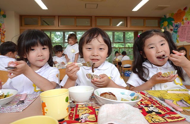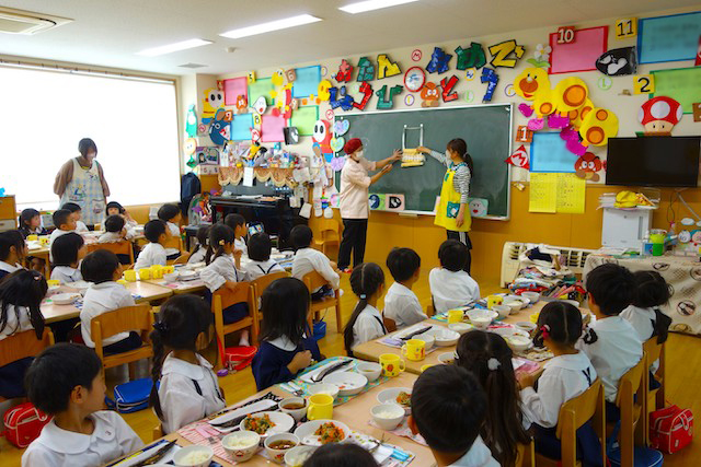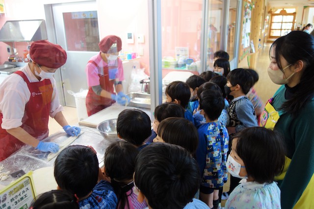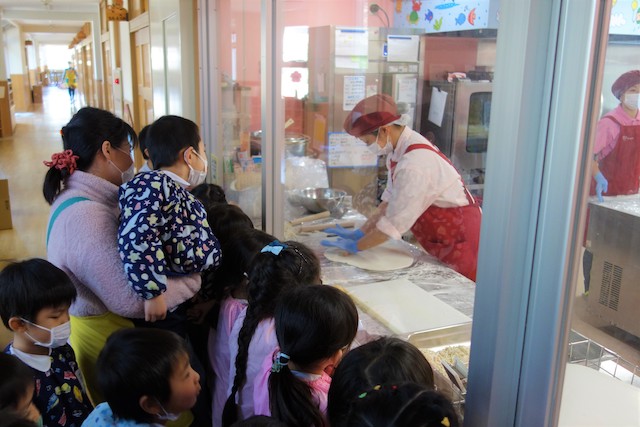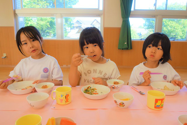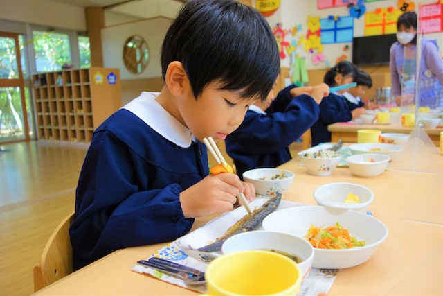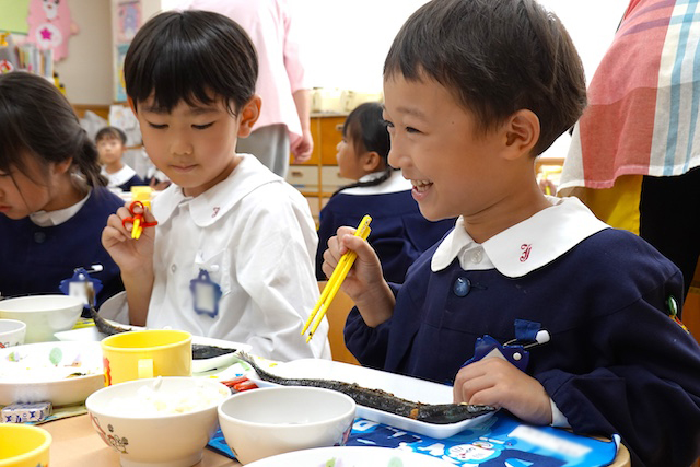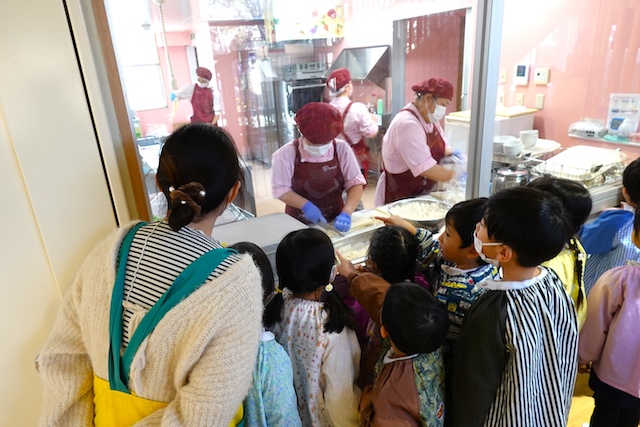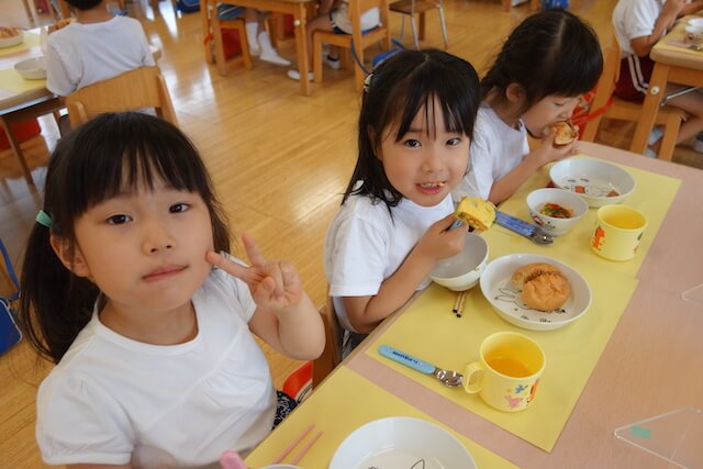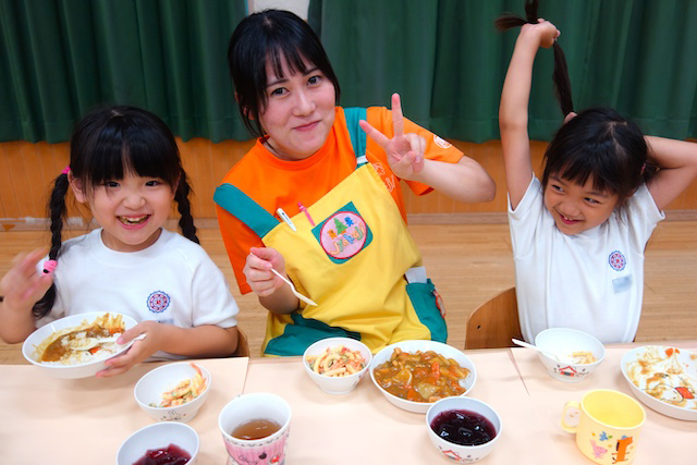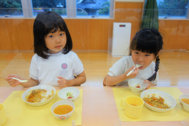 曜日によって自園給食を全員で食べます。