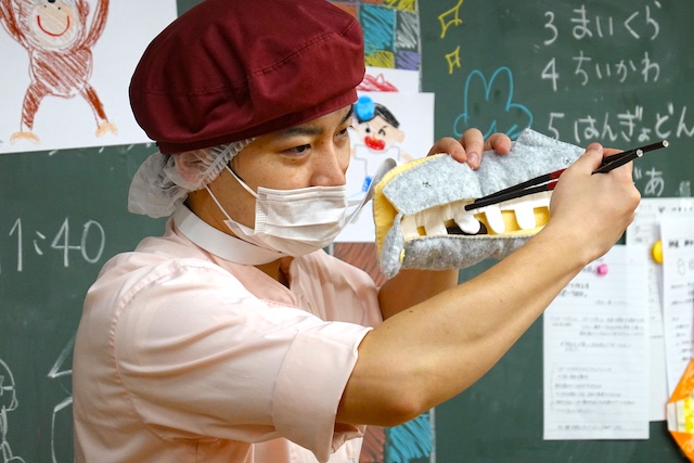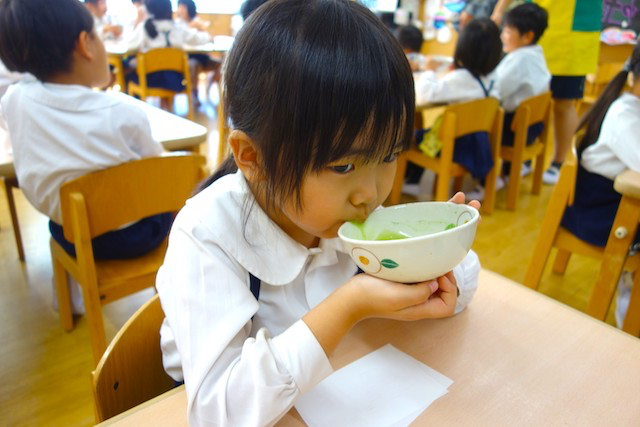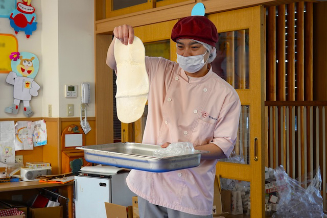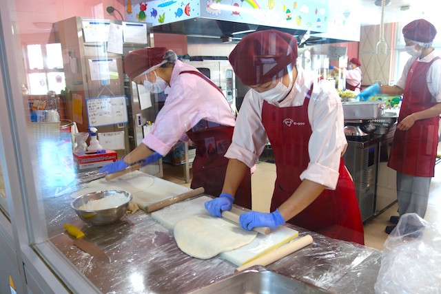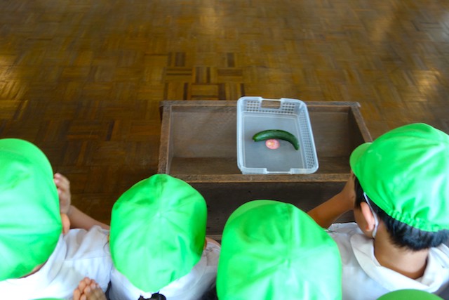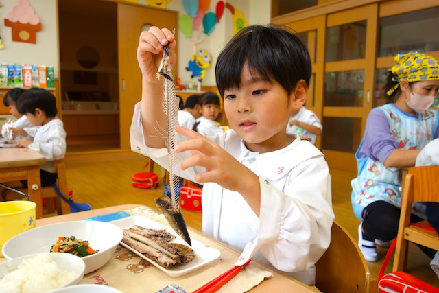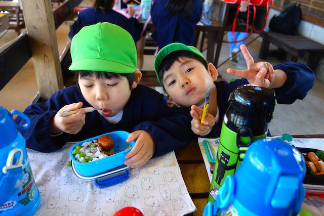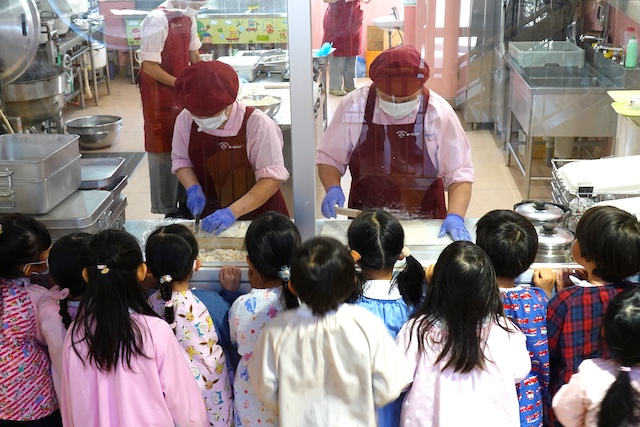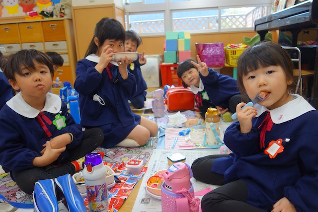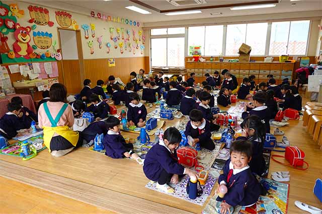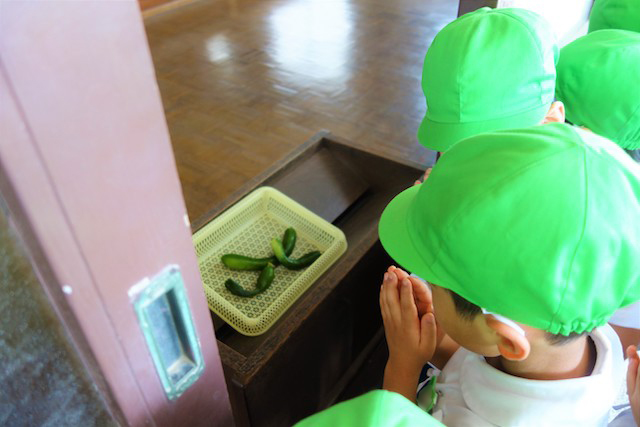 曜日によって自園給食を全員で食べます。