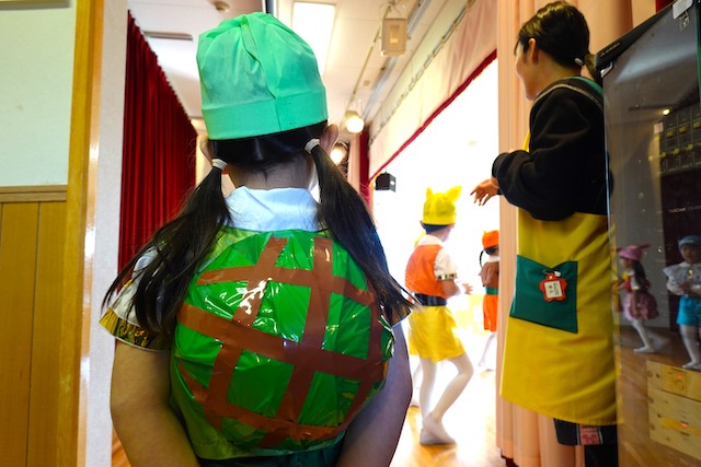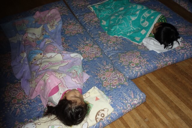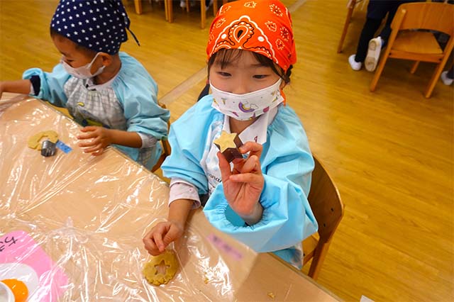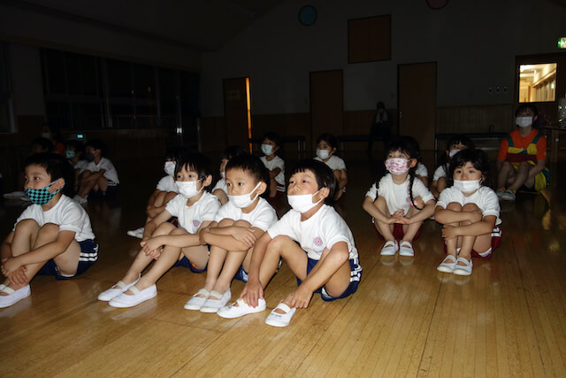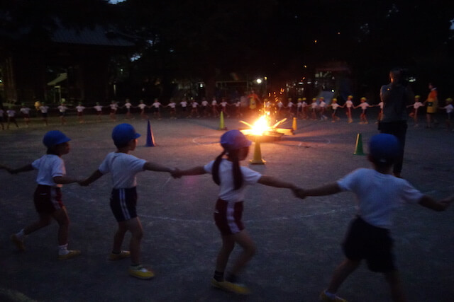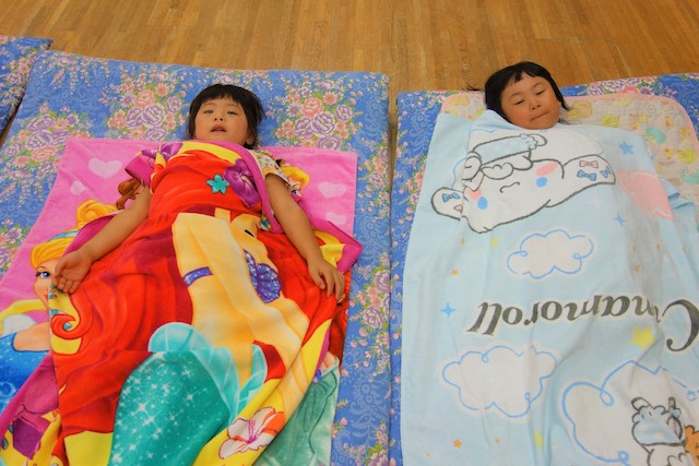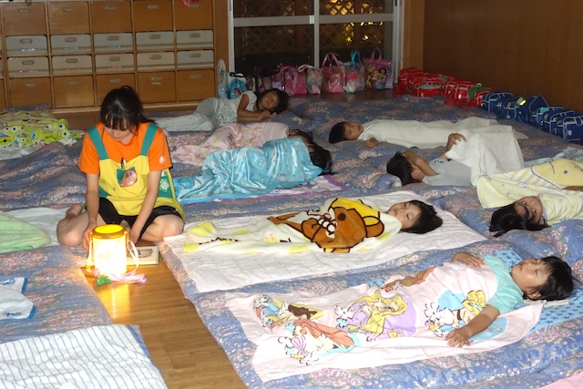 - 家族から離れてちょっぴりドキドキしながらも慣れ親しんでいる幼稚園に泊まります。