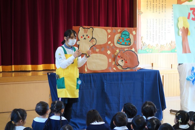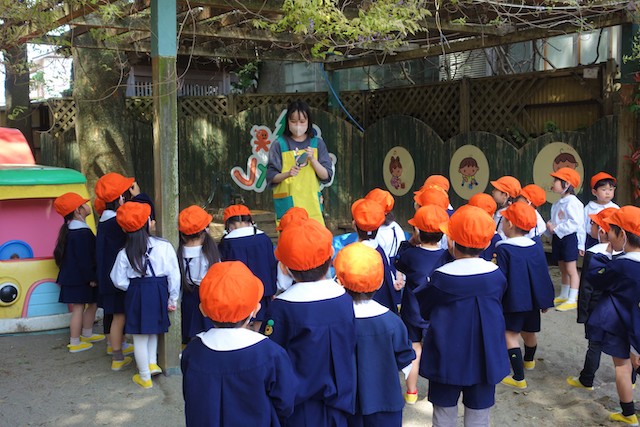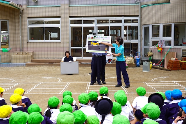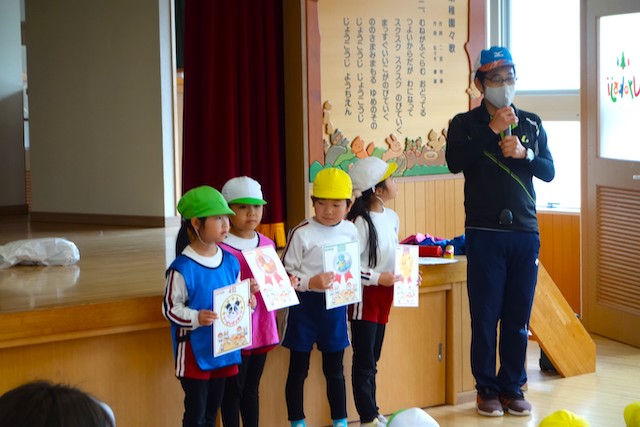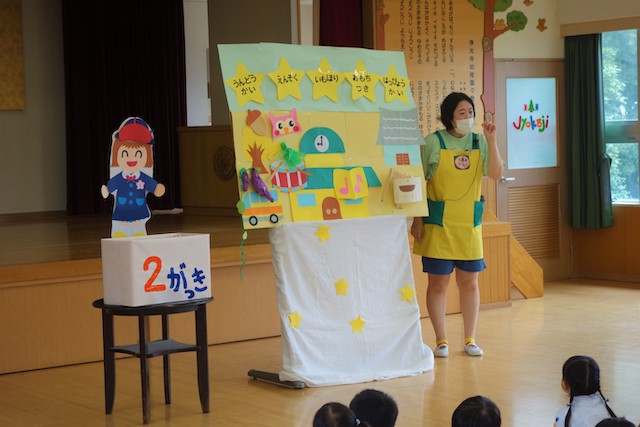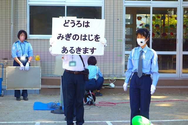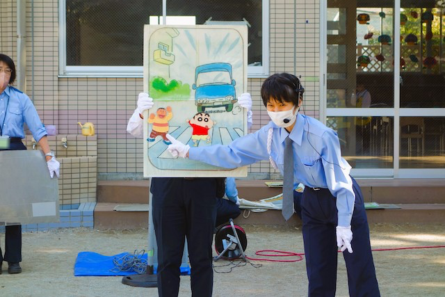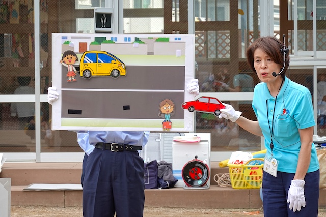 外で横断歩道を渡る時の注意点を、紙芝居でわかりやすく教えていただきました。