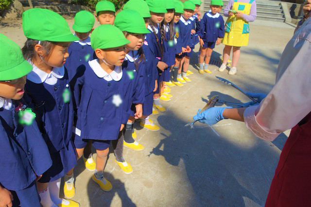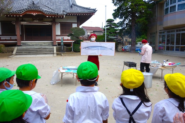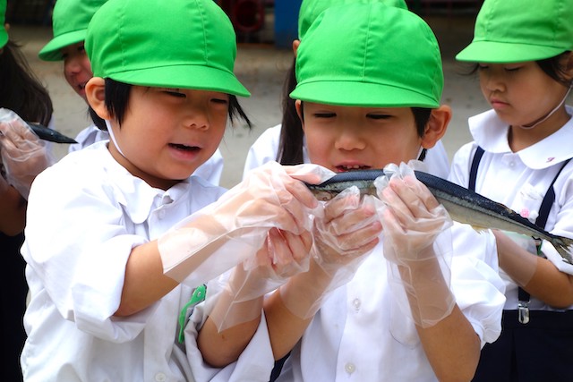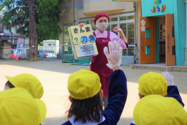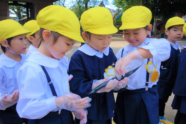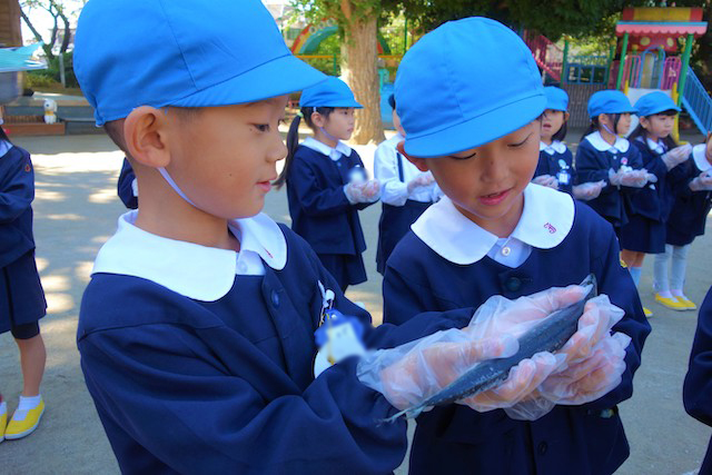 園庭でミールケアさんからサンマの説明を聞き、実際に生のサンマを持って観察してみました。
