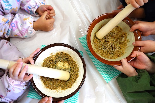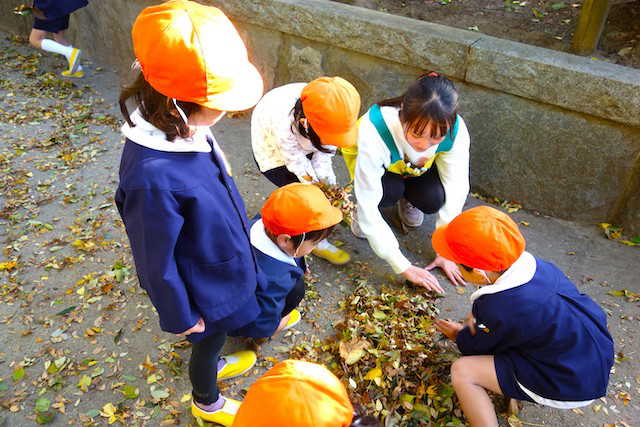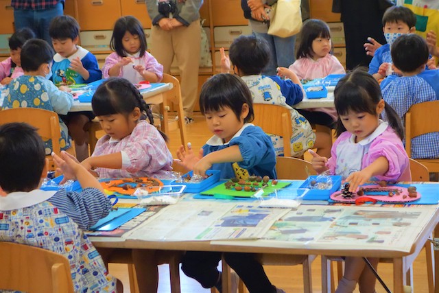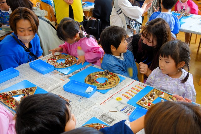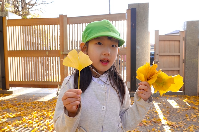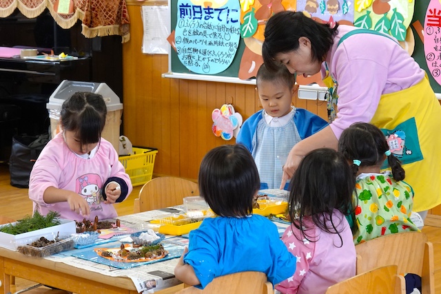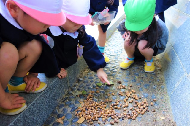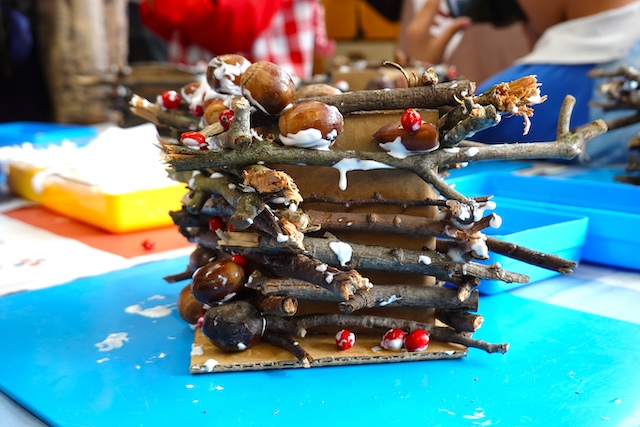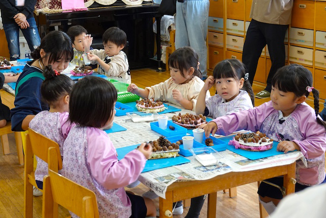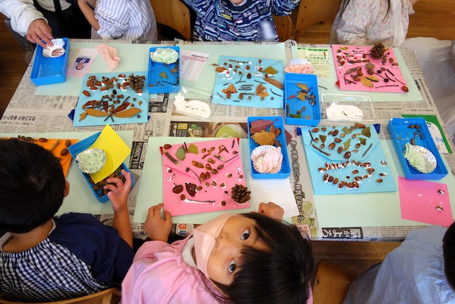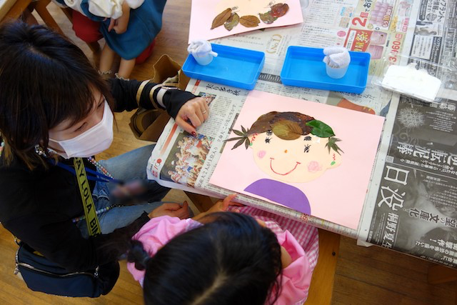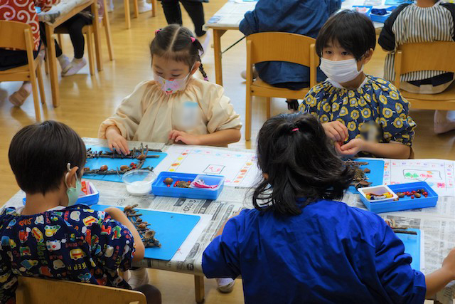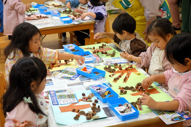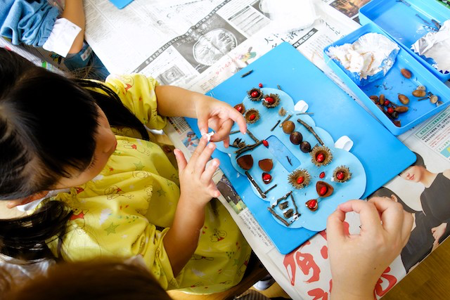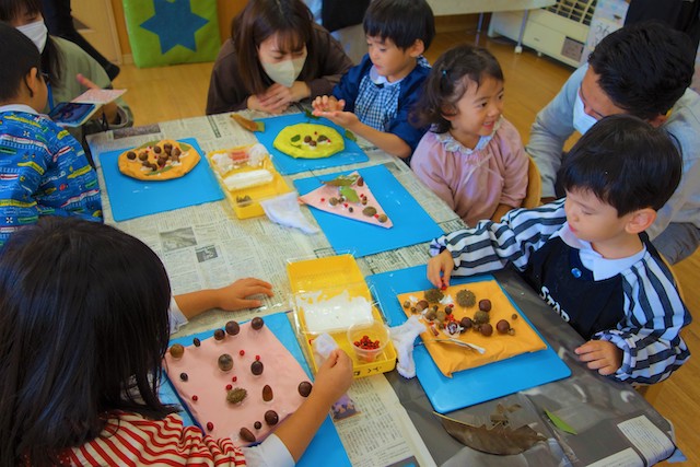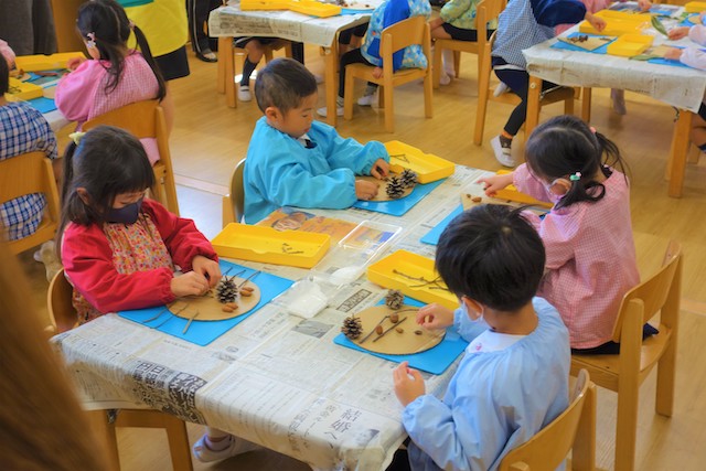 秋の保育参観では、秋の自然物(落ち葉や枝、木の実、ドングリ、松ぼっくりなど)を使った製作物を作ります!