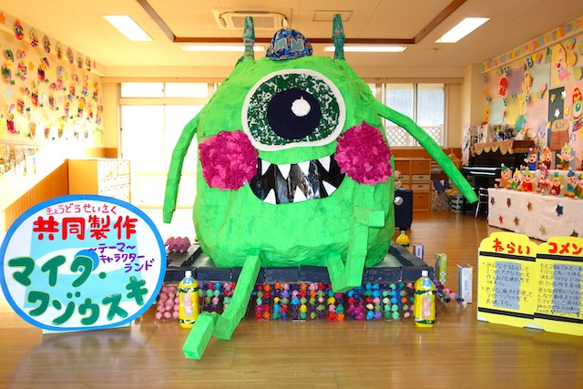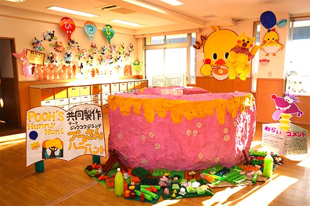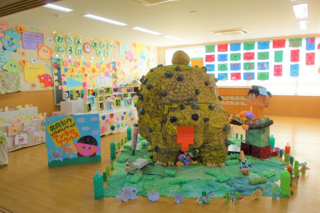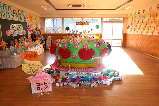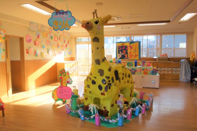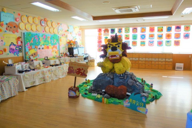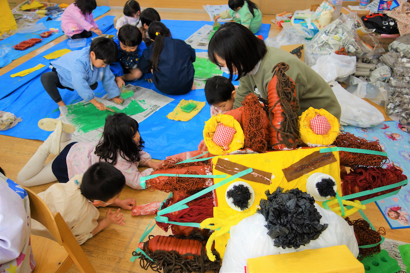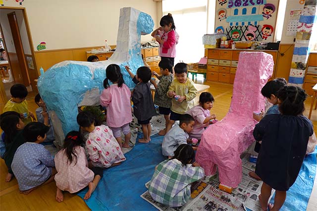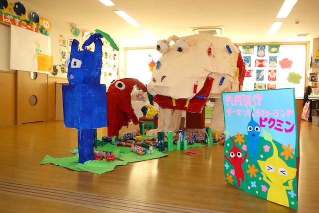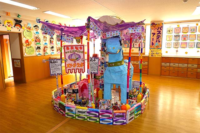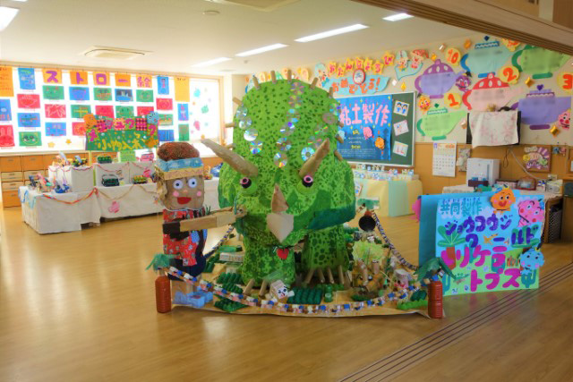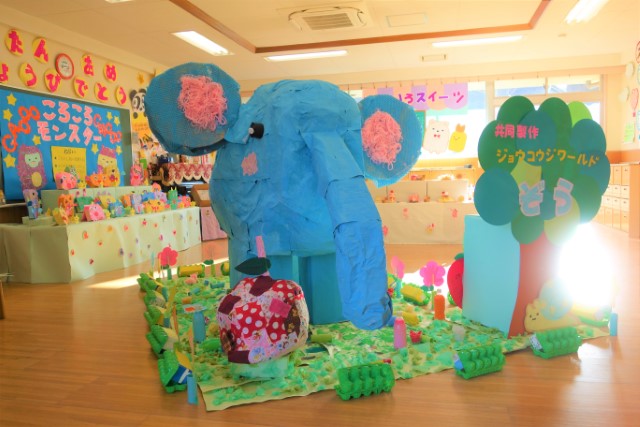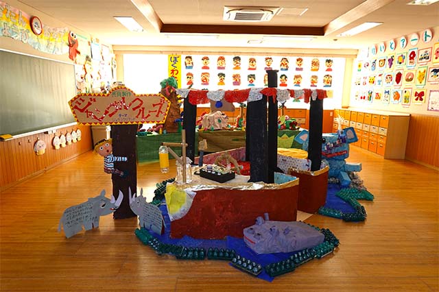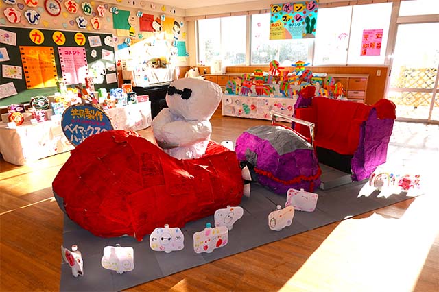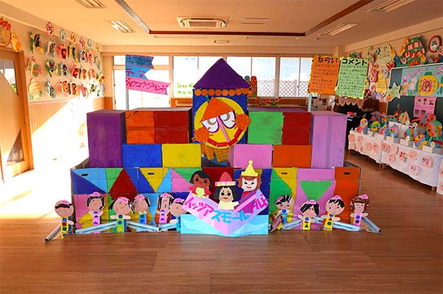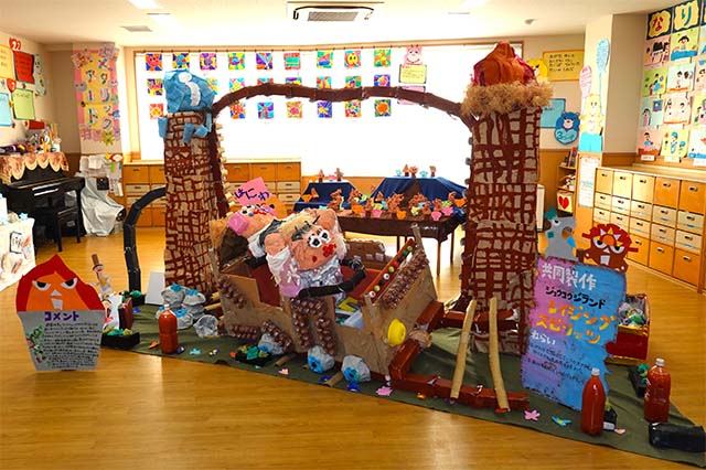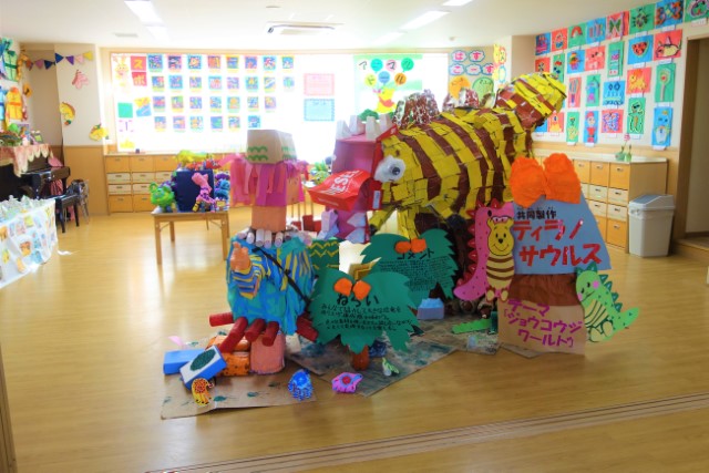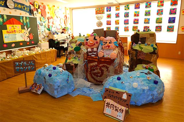 個人作品のほかにクラス全員で作る共同作品もあります。作っていく過程での個性や創造力を養い、協調性も身につけていきます。