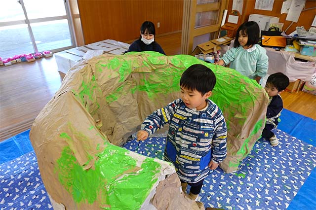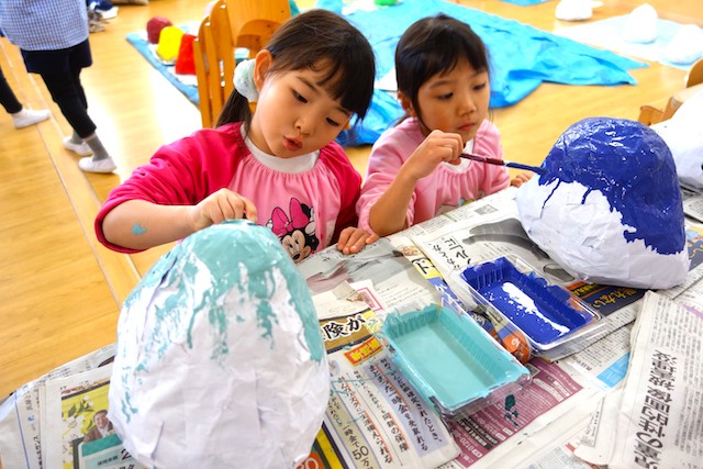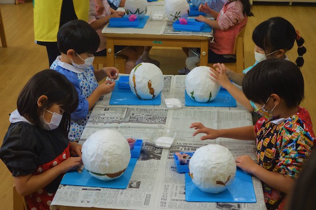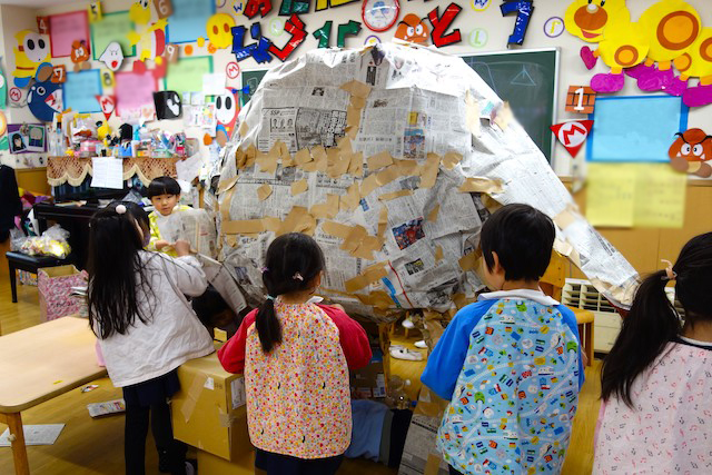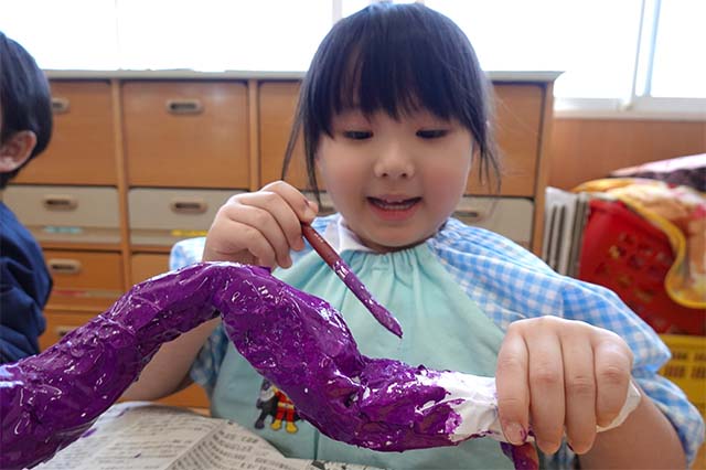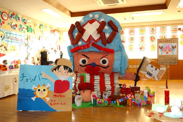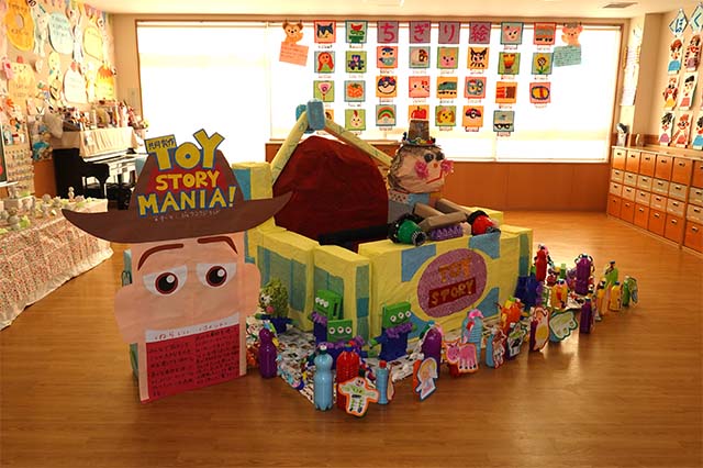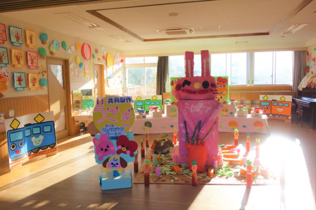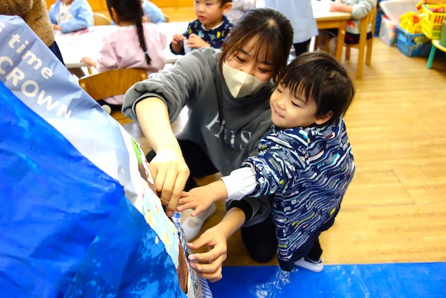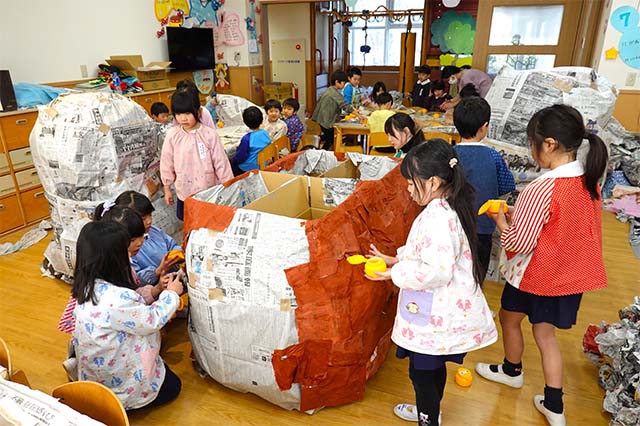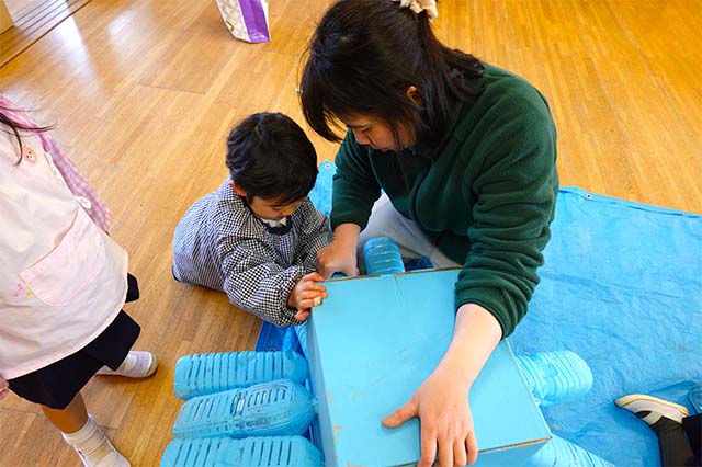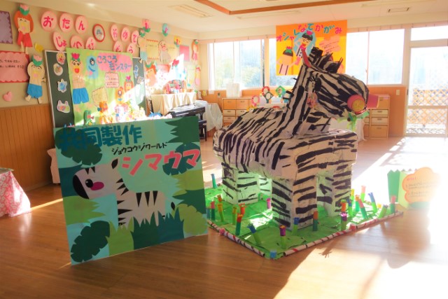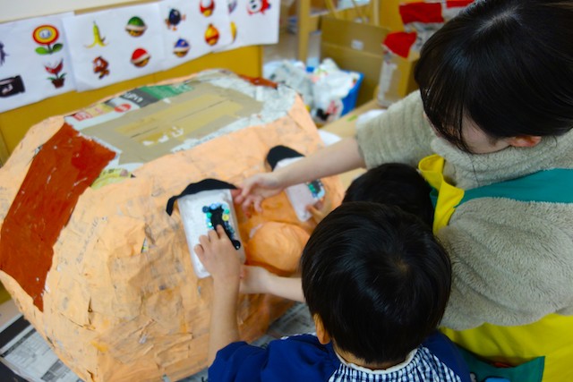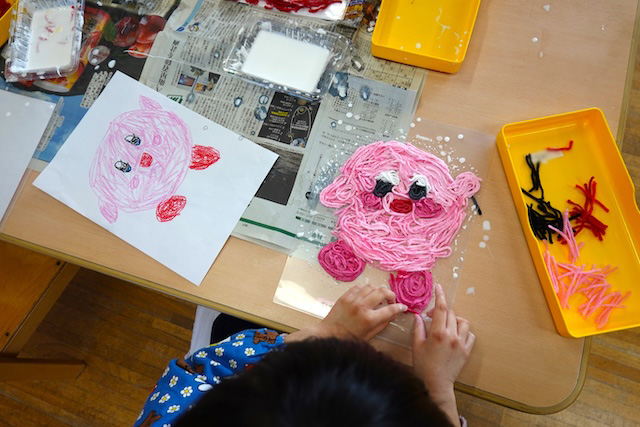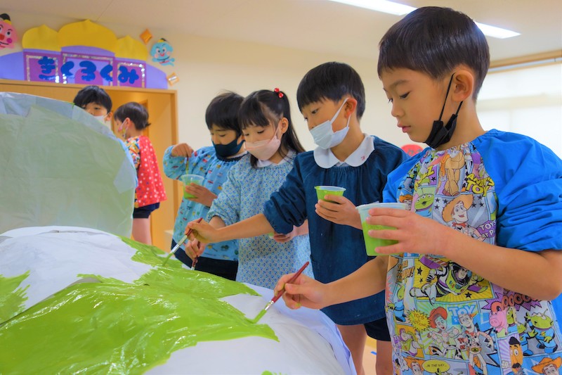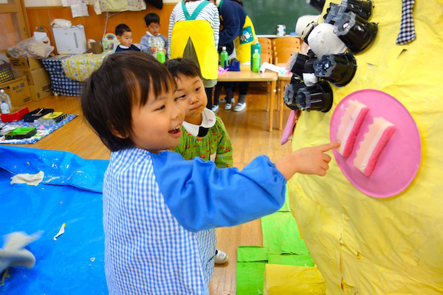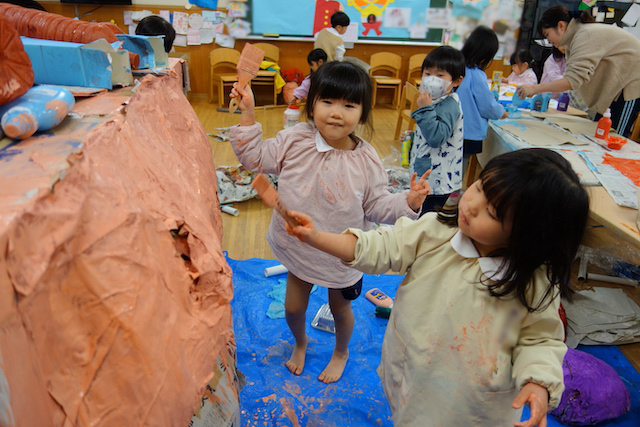 個人作品のほかにクラス全員で作る共同作品もあります。作っていく過程での個性や創造力を養い、協調性も身につけていきます。