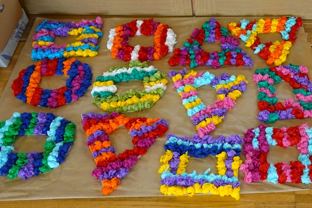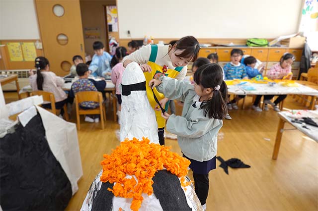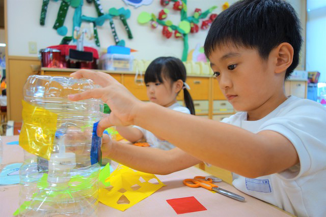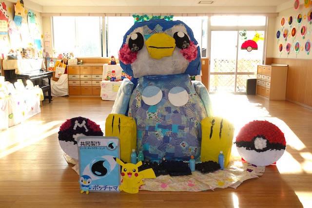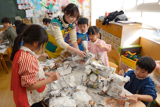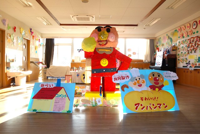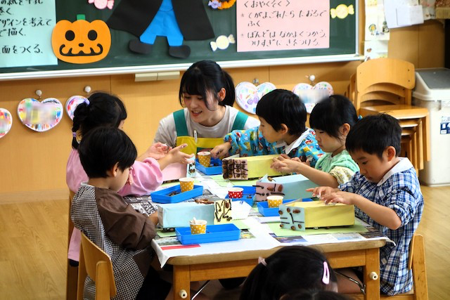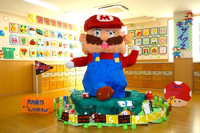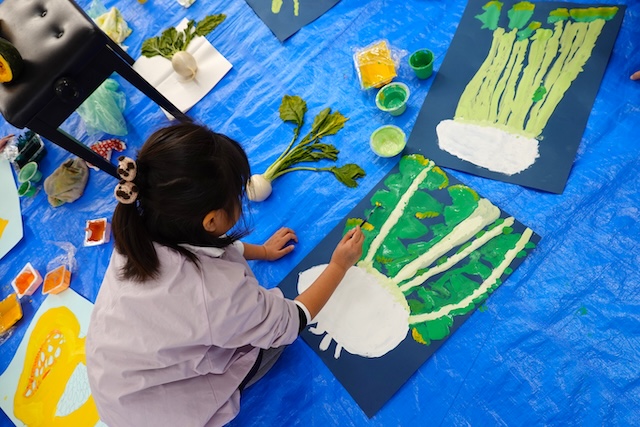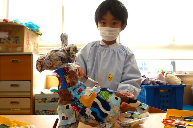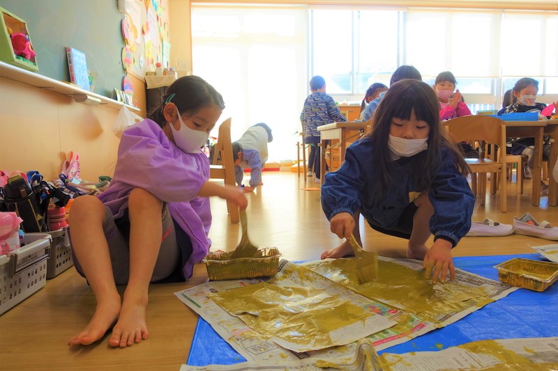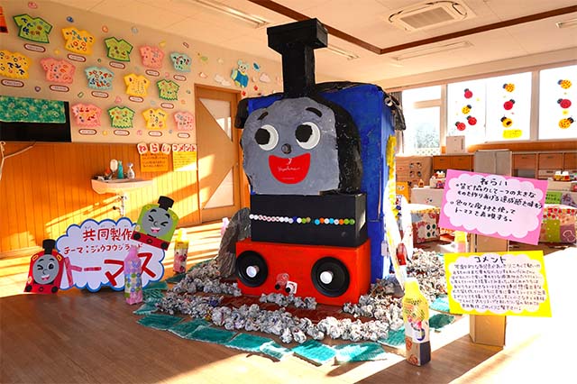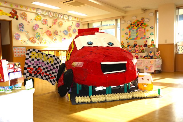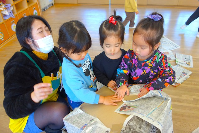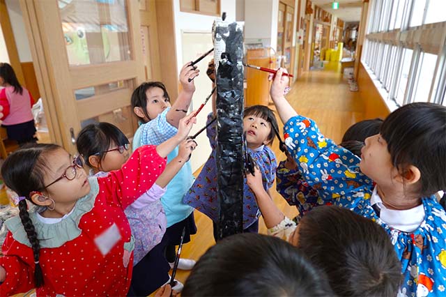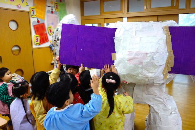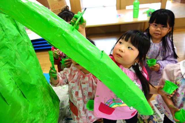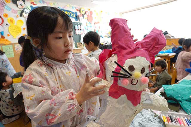 個人作品のほかにクラス全員で作る共同作品もあります。作っていく過程での個性や創造力を養い、協調性も身につけていきます。
