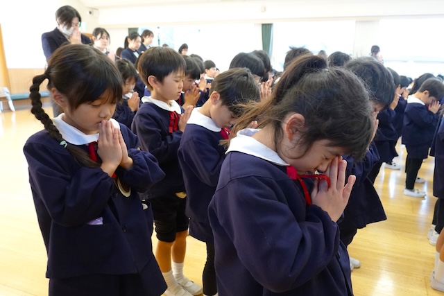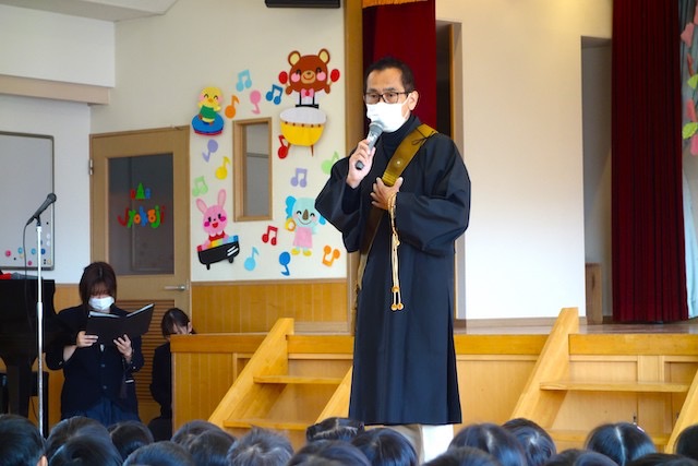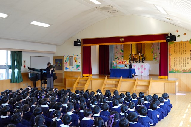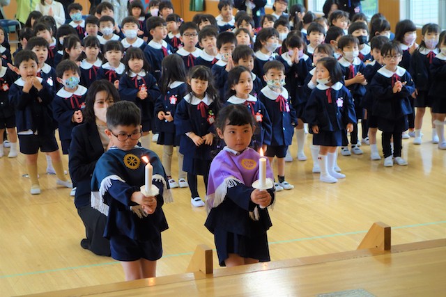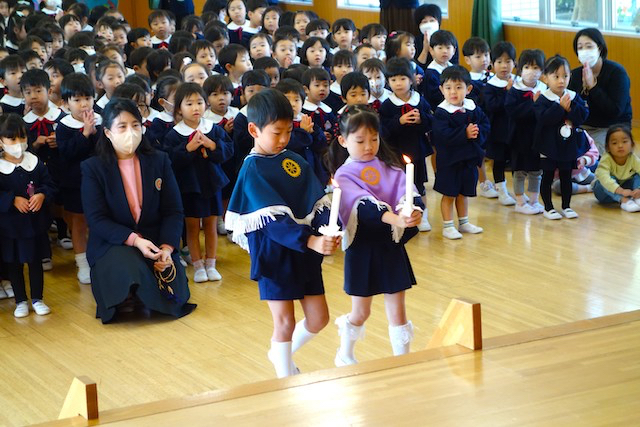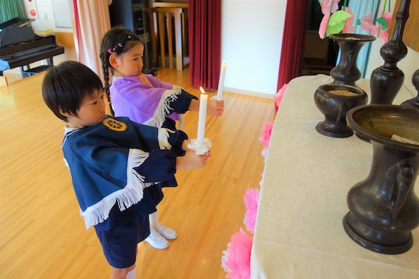 まずは、代表の子ども達による献灯、献香、献華が行われ、みんなでのの様の歌を歌いました。