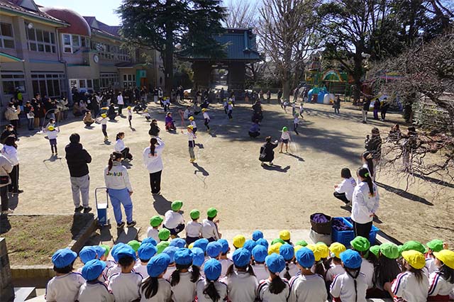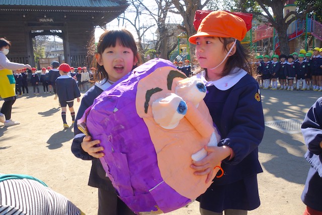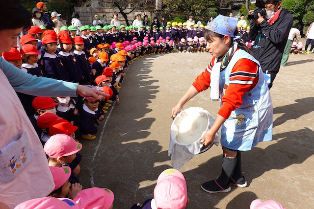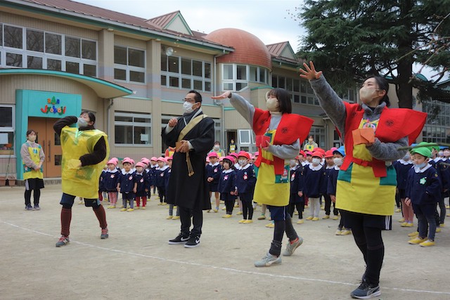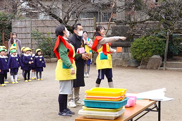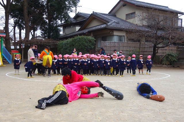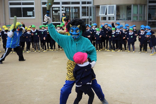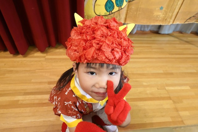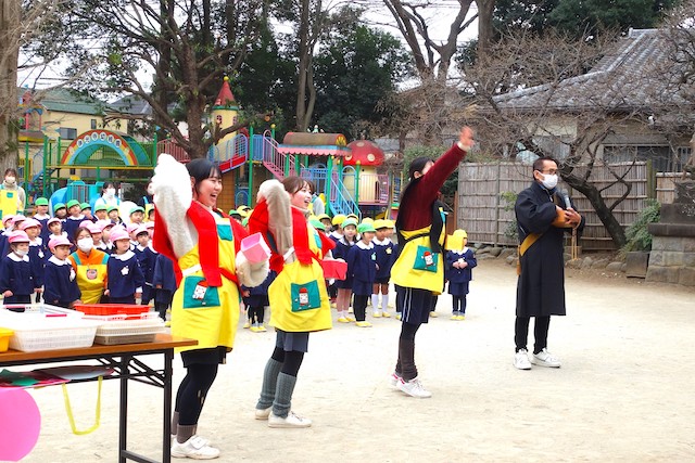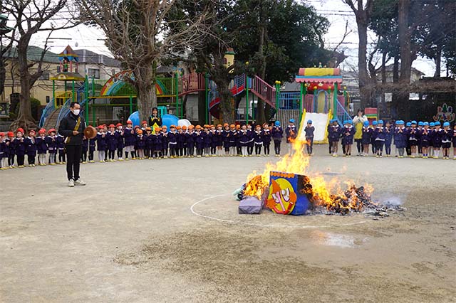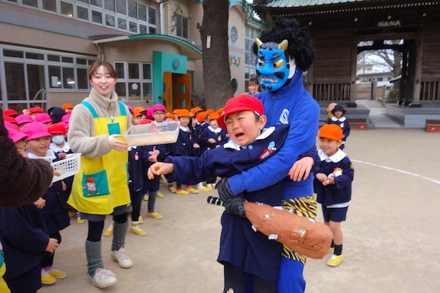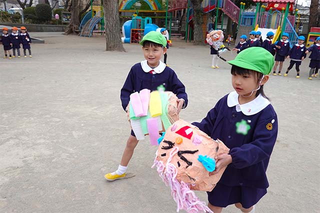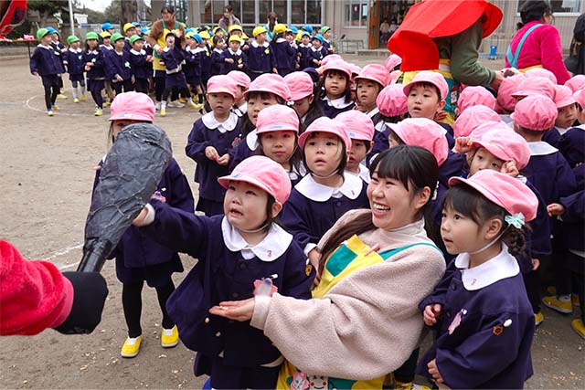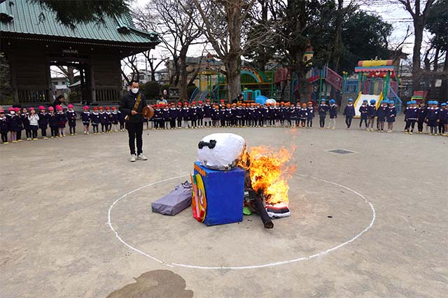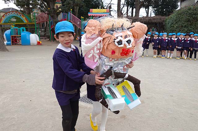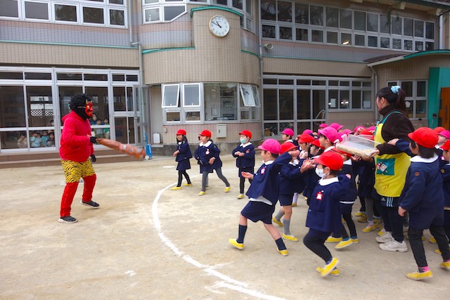 - 全園児で豆まきをすることで心の鬼をはらいます。