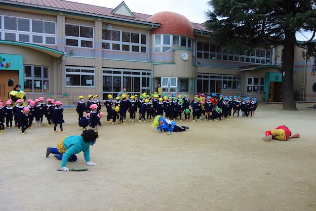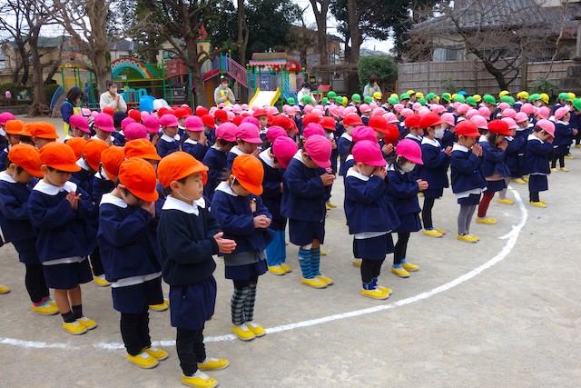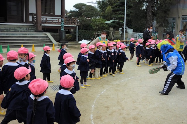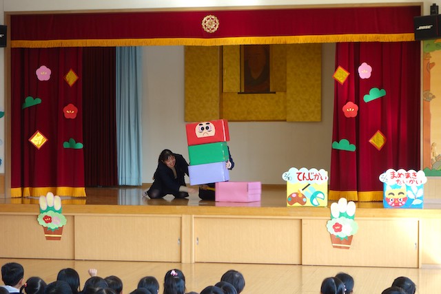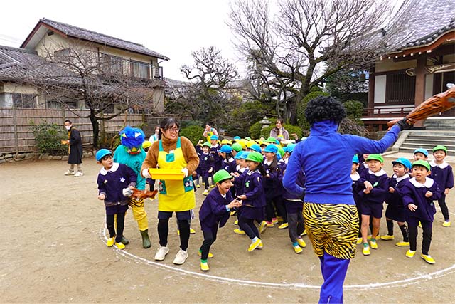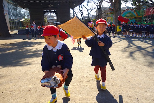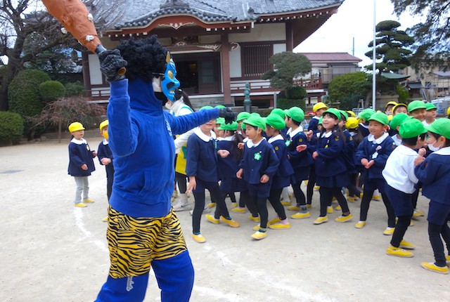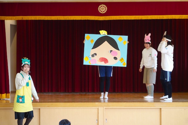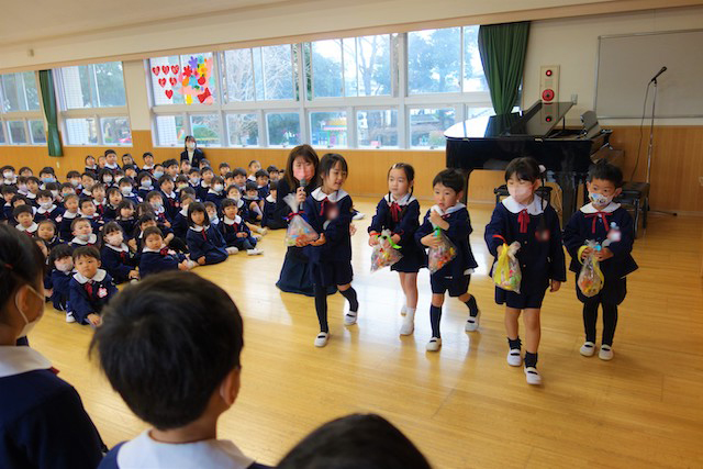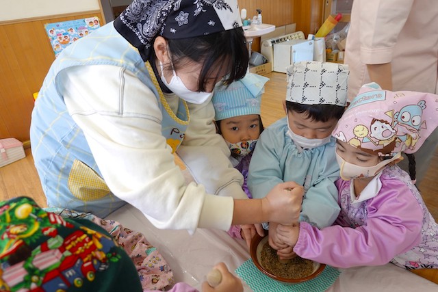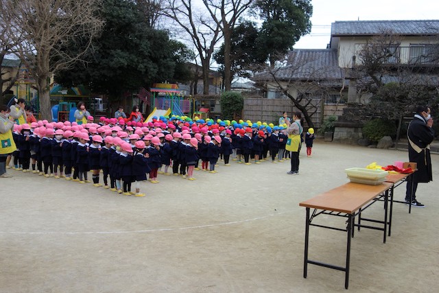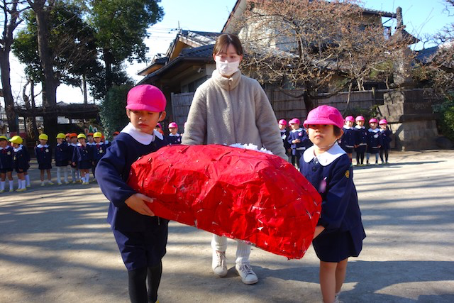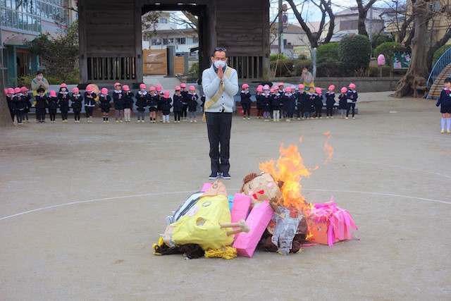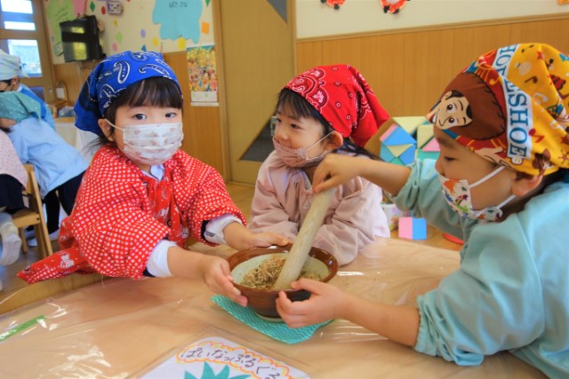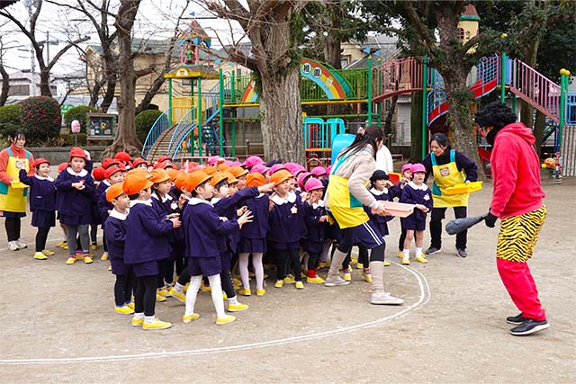 - 全園児で豆まきをすることで心の鬼をはらいます。