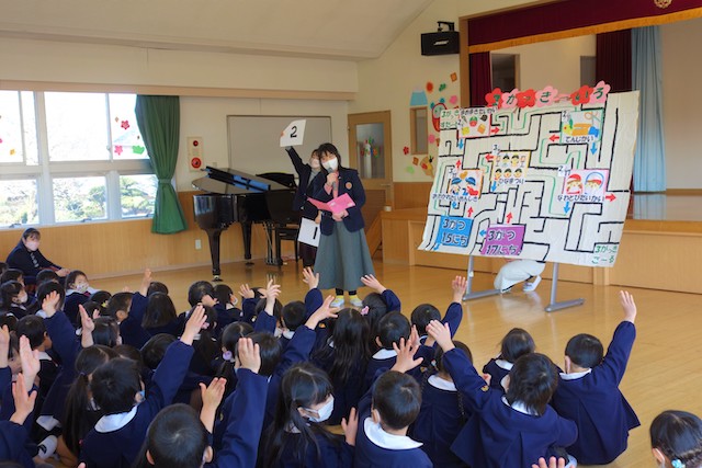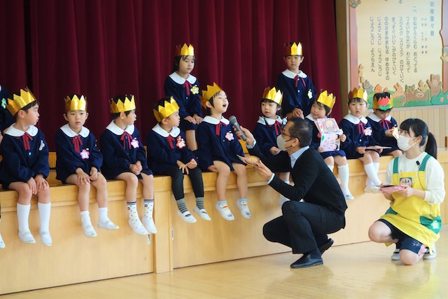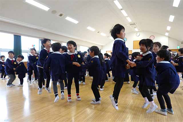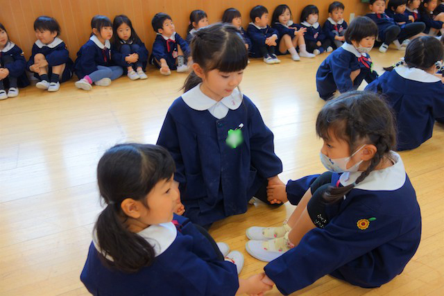 - 卒園する年長と年中・年少の子ども達がお別れの会を行います。この日はタテ割りでゲームをしたり合同会食もして、思い出作りをします。