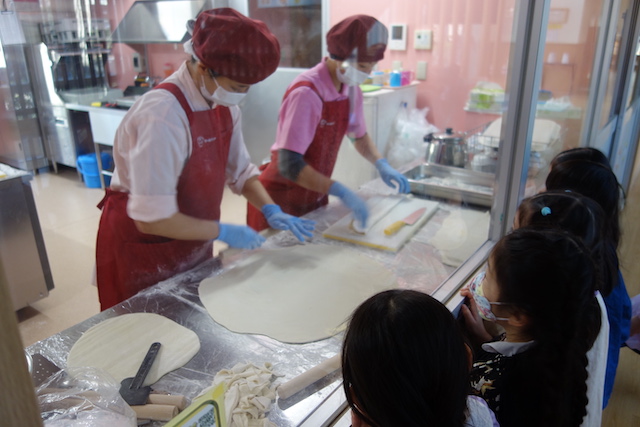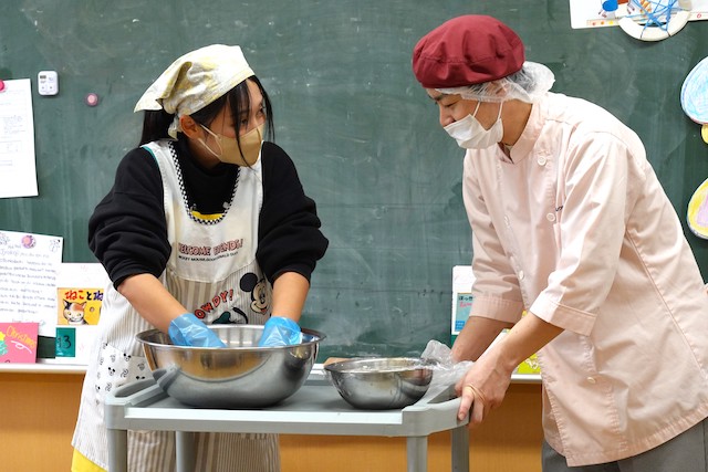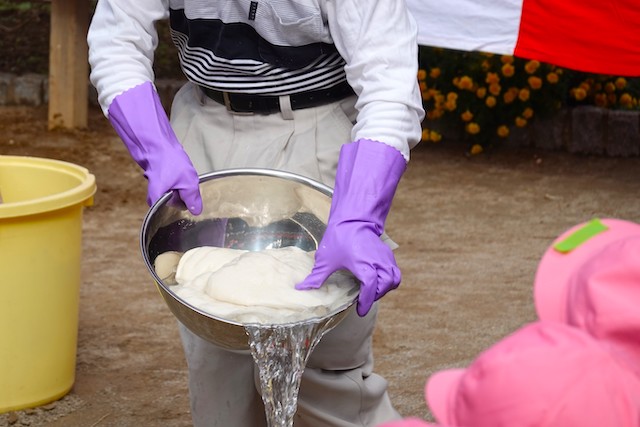 この日はPTAの方々にご協力いただき、翌日のもちつき大会に使うもち米を研いでもらっているところを見学しました。
