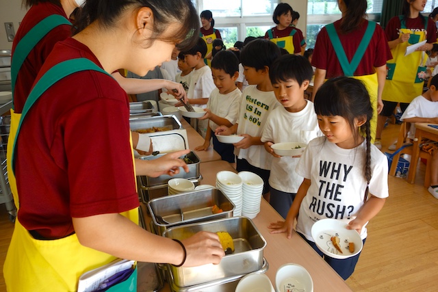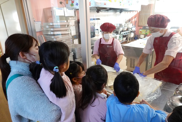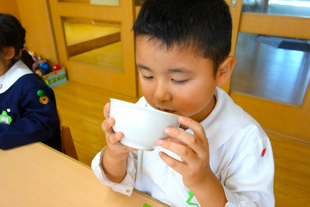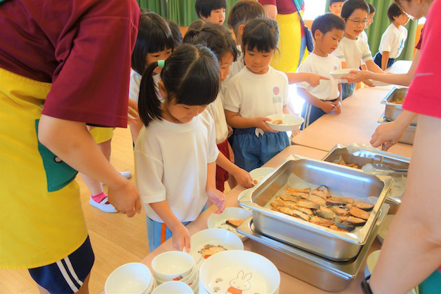 年長は配膳も手伝います。野菜嫌いな子ども達も手作り料理で温かい物だと自然と口にしてくれています。