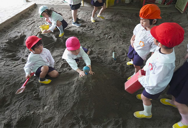 どのクラスの子どもたちともあそべる自由な時間です。砂場は大人気です。